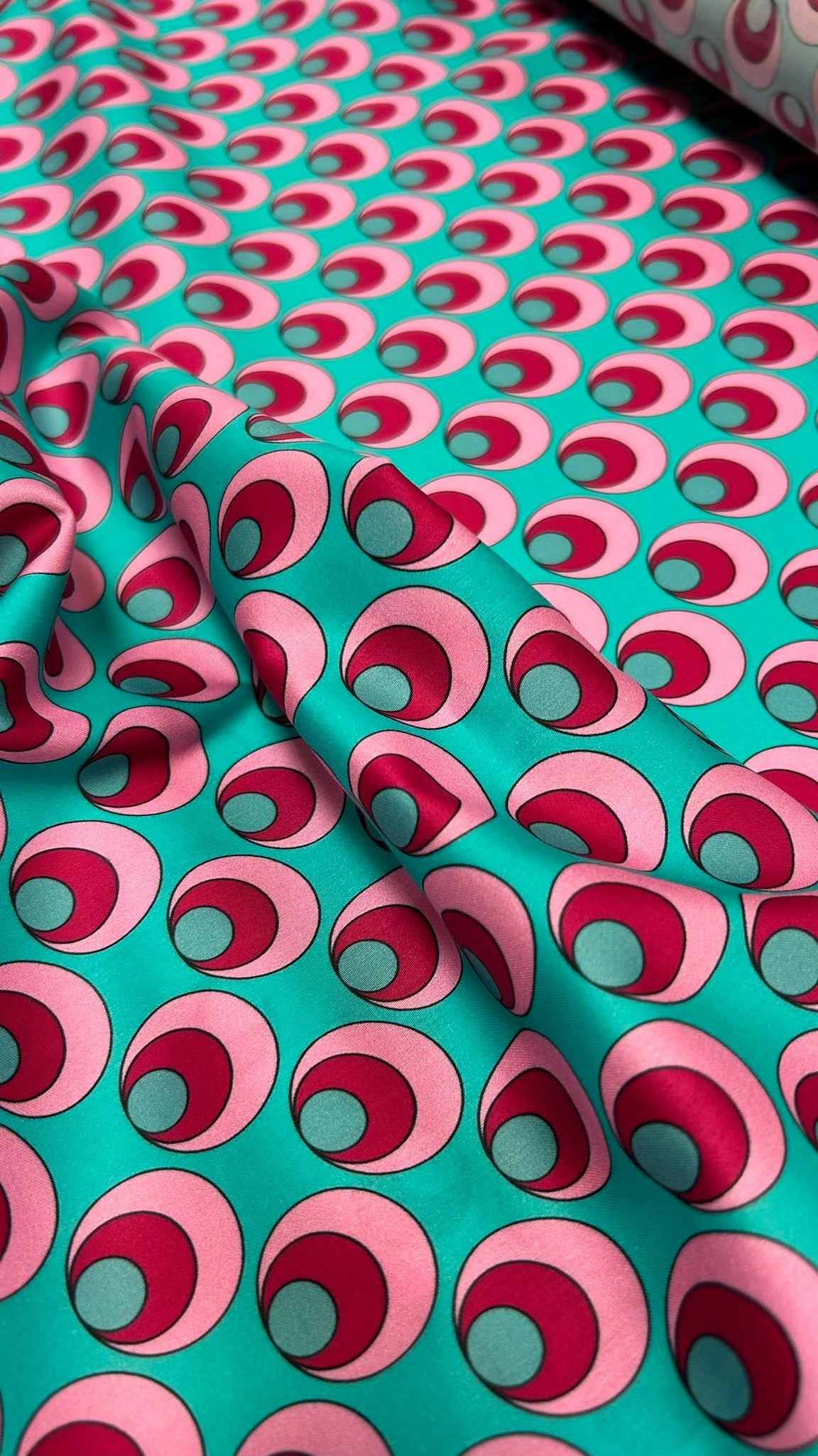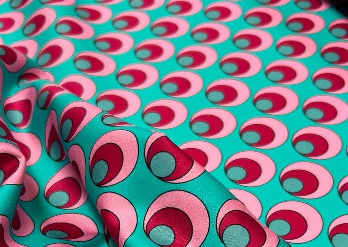 Eksklusiv bomuld i høj kvalitet med et legende mønster i turkis, lyserød og magenta.