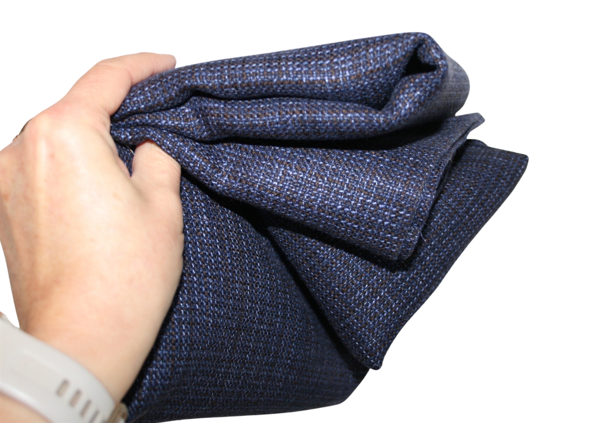 Lækker uld i en blå/brun vævning - stoffet har også en mørkere side. Brug fx stoffet til nederdel.