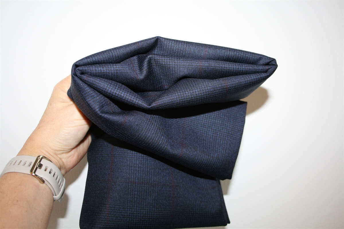 Lækker blåsort uld med diskrete bordeaux tern. Kvaliteten er let-medium kraftig. Ulden er en del af et restparti fra en high-end italiensk producent.