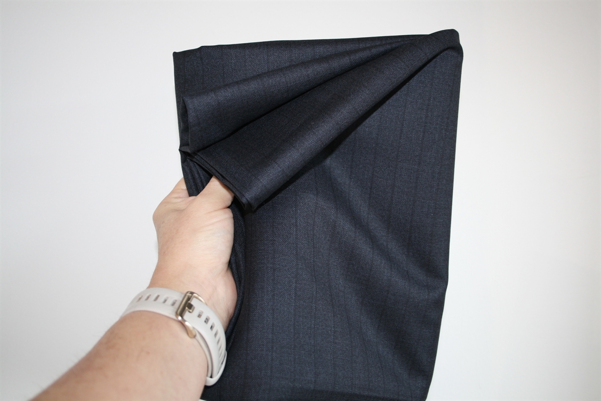 Lækker blåsort uld med lodrette nålestriber. Kvaliteten er let-medium kraftig. Ulden er en del af et restparti fra en high-end italiensk producent.