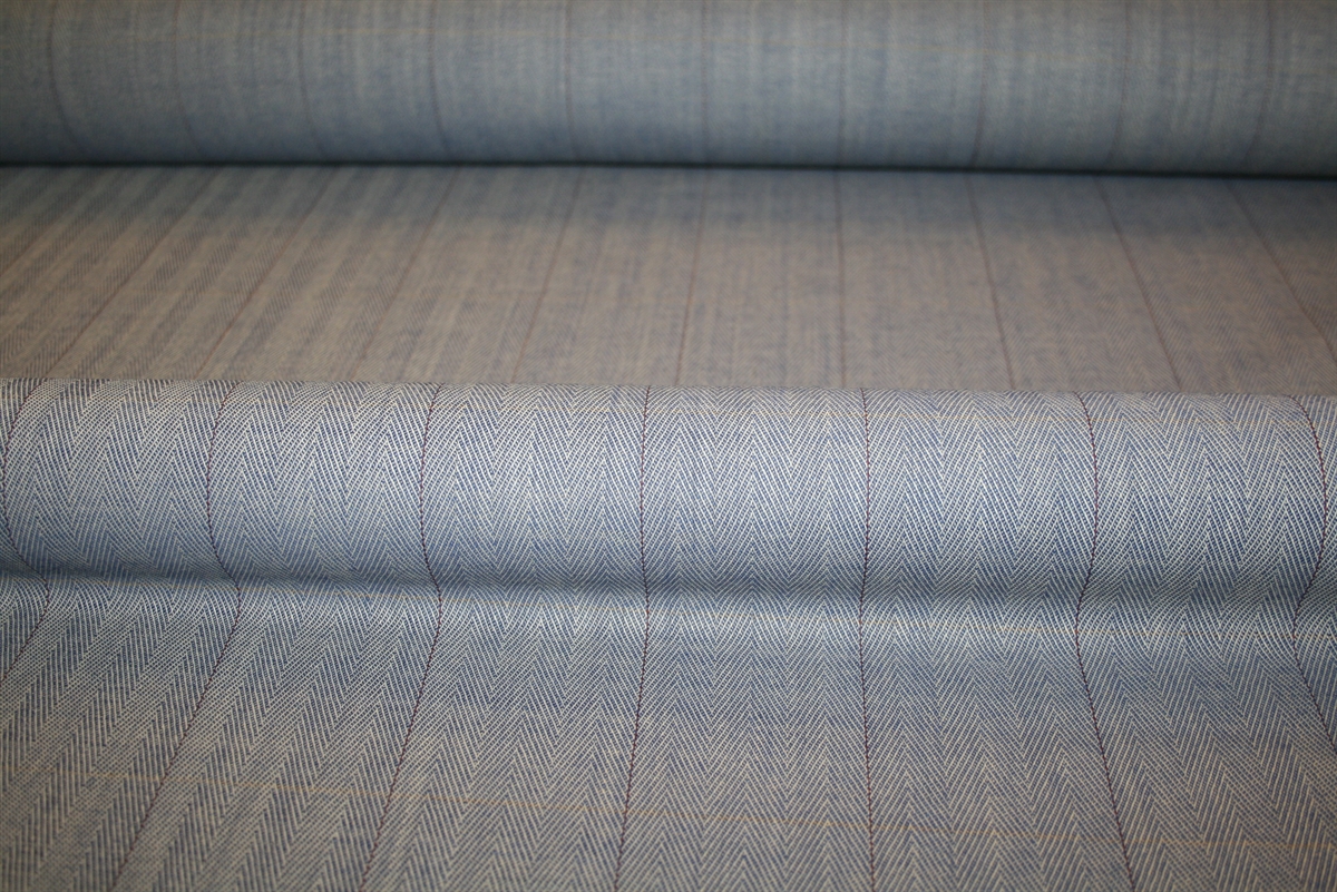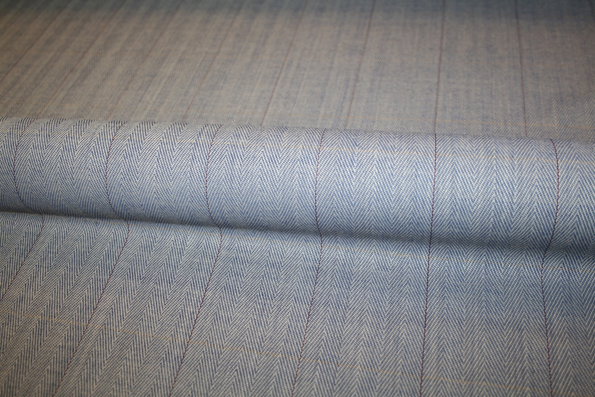 Flot sildebensvævet uld med en subtil lysegul stribe vandret og en bordeaux stribe lodret. Kvaliteten er lettere. Stoffet er deadstock fra et italiensk modehus.