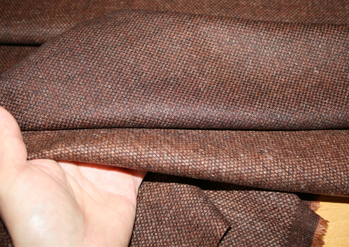 Lækker uld i en flerfarvet (pique)vævning og to anvendelige sider; en mørkere og en lysere (rød)brun. Kvaliteten er blød og let-medium kraftig.