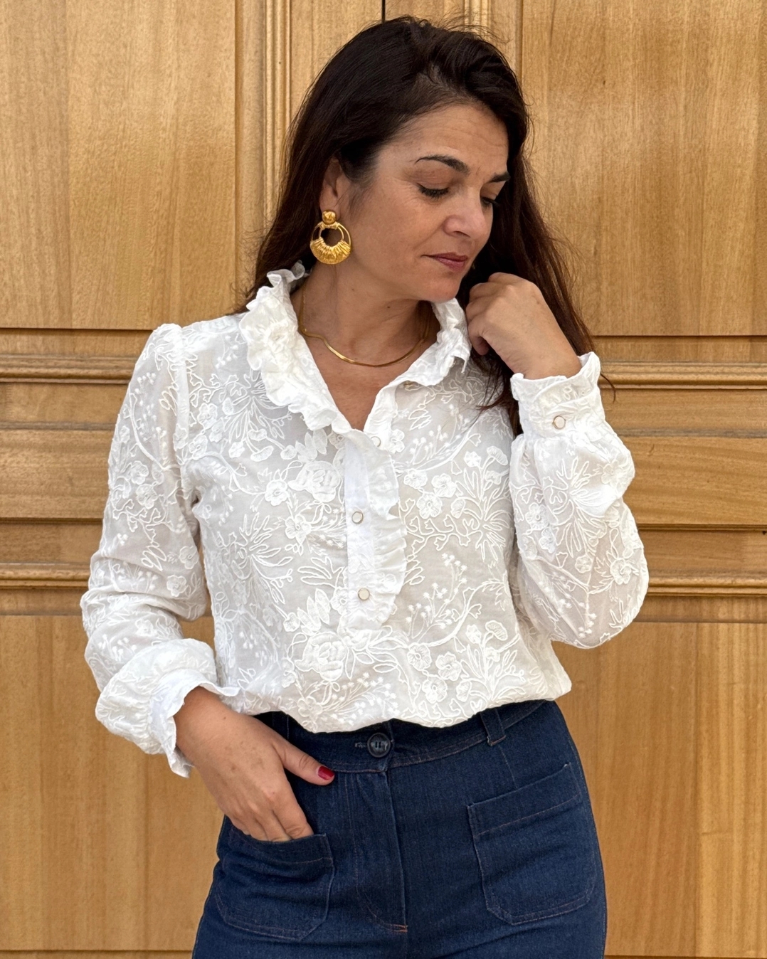 Modellen fungerer bedst i vævede, ikke alt for kraftige, metervarer som fx bomuld (broderie anglaise), viskose og silke. Til den hvide version af blusen er brugt denne broderie anglaise.