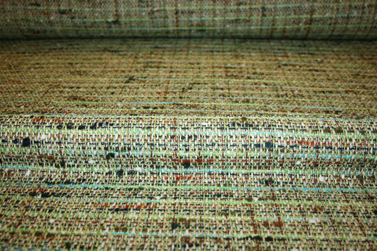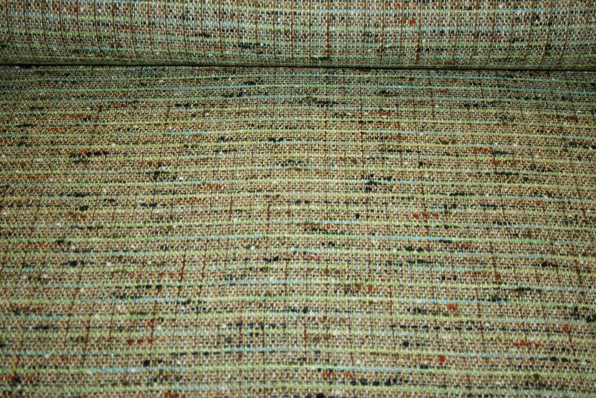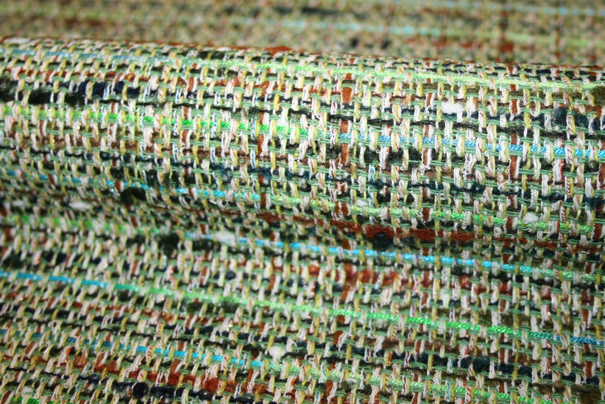 Denne eksklusive bouclé fra Italien er vævet i en spændende struktur, hvor tekstur og farvespil arbejder smukt sammen. Stoffet kombinerer varme jordfarver som brun og rust med friske grønne toner og dybe mørke accenter og et strejf af turkisblå. Kvaliteten er perfekt til tidløse sæt (jakke og nederdel/kjole) og accessories. Med sin italienske oprindelse forener stoffet traditionelt håndværk med et moderne farveudtryk, der både kan styles klassisk og mere eksperimenterende.