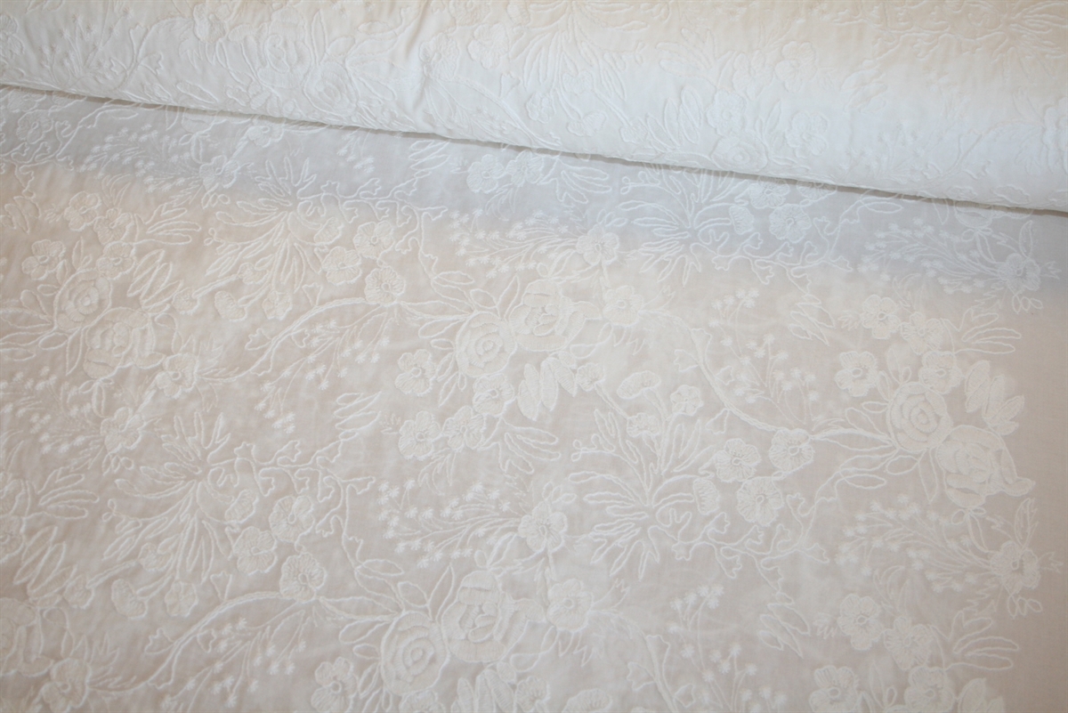 100% bomuld med et ualmindeligt smukt relief af broderier. Kvaliteten er let transparent.