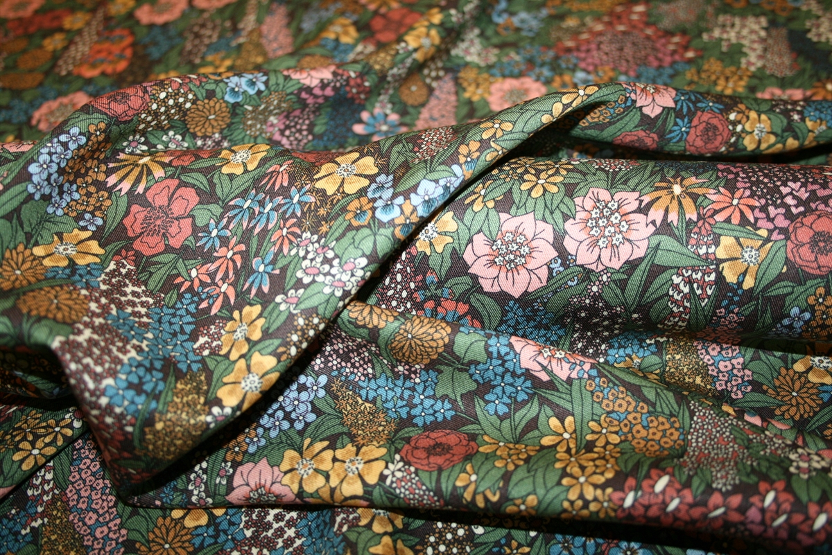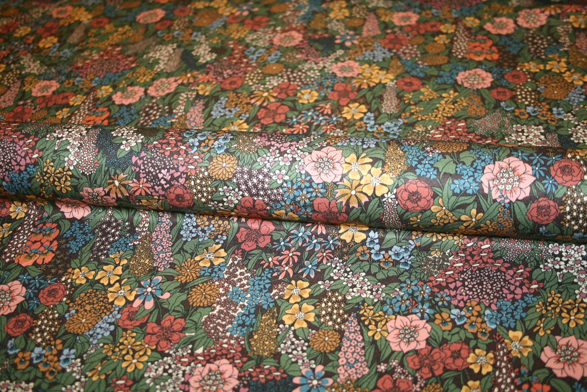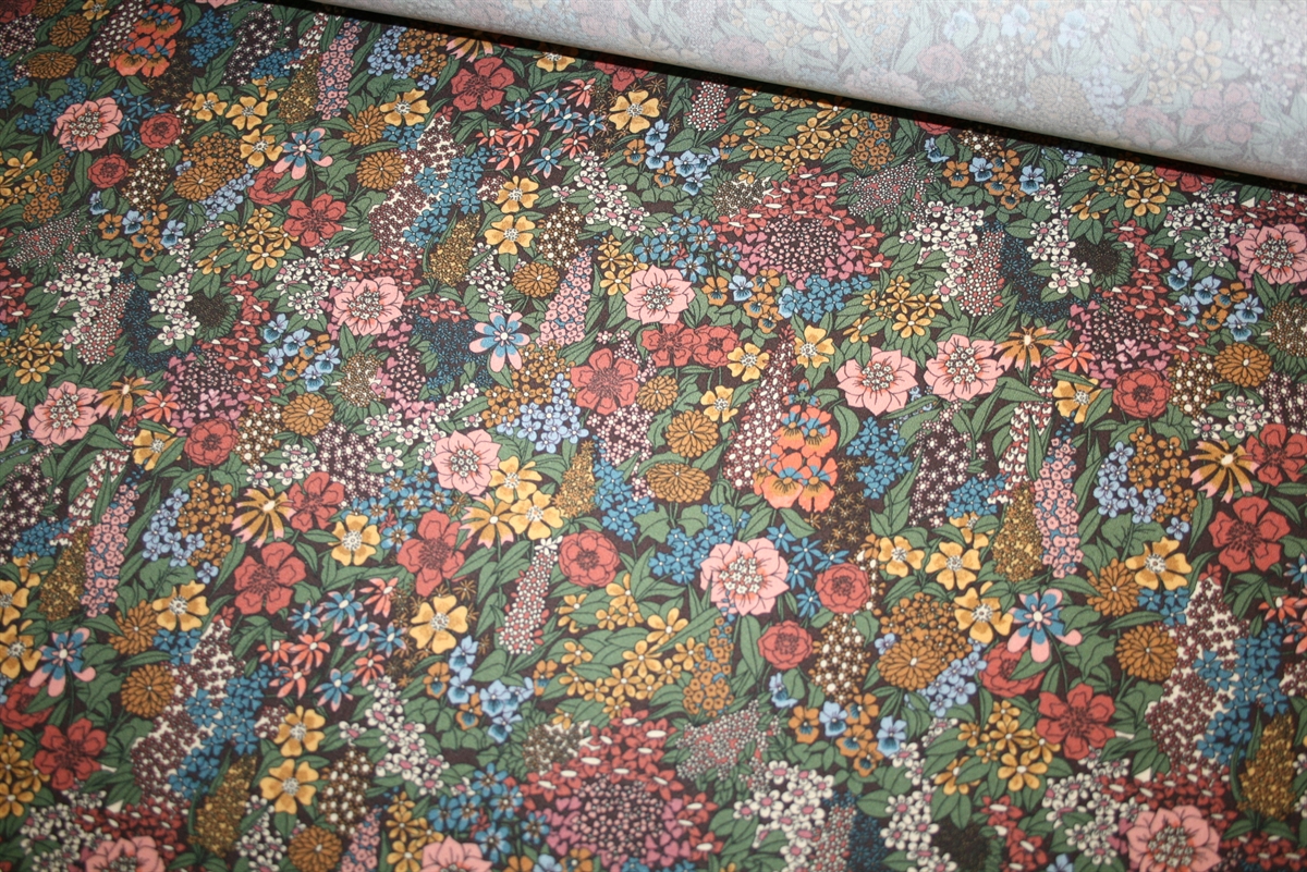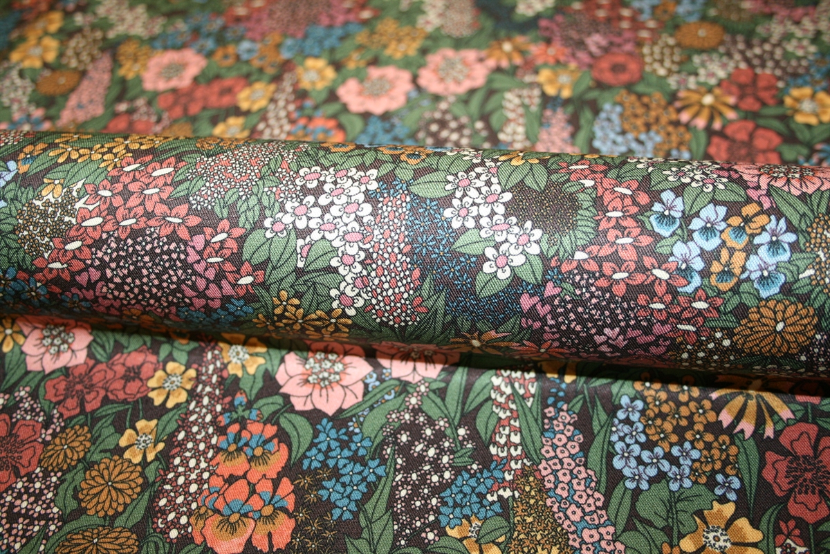Twillvævet 'Weymouth' viskose med et smukt blomsterprint på en mørkebrun bund. Sublim kvalitet fra Liberty Fabric til den kræsne.