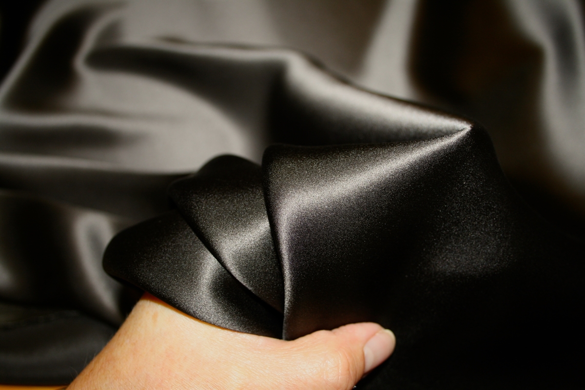 Satinvævet silke i mørkebrun. Stoffet er produceret for et stort italiensk modehus.