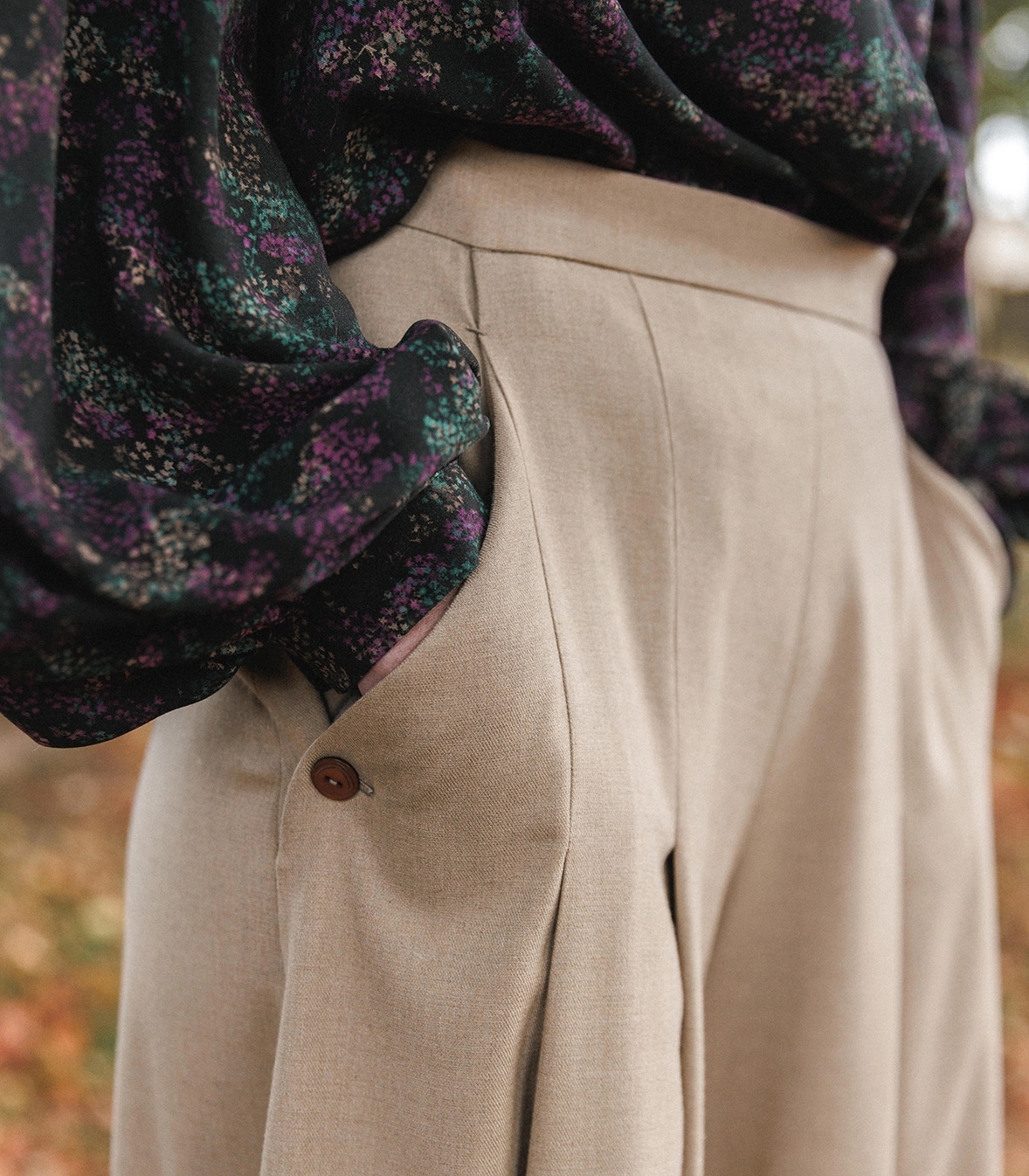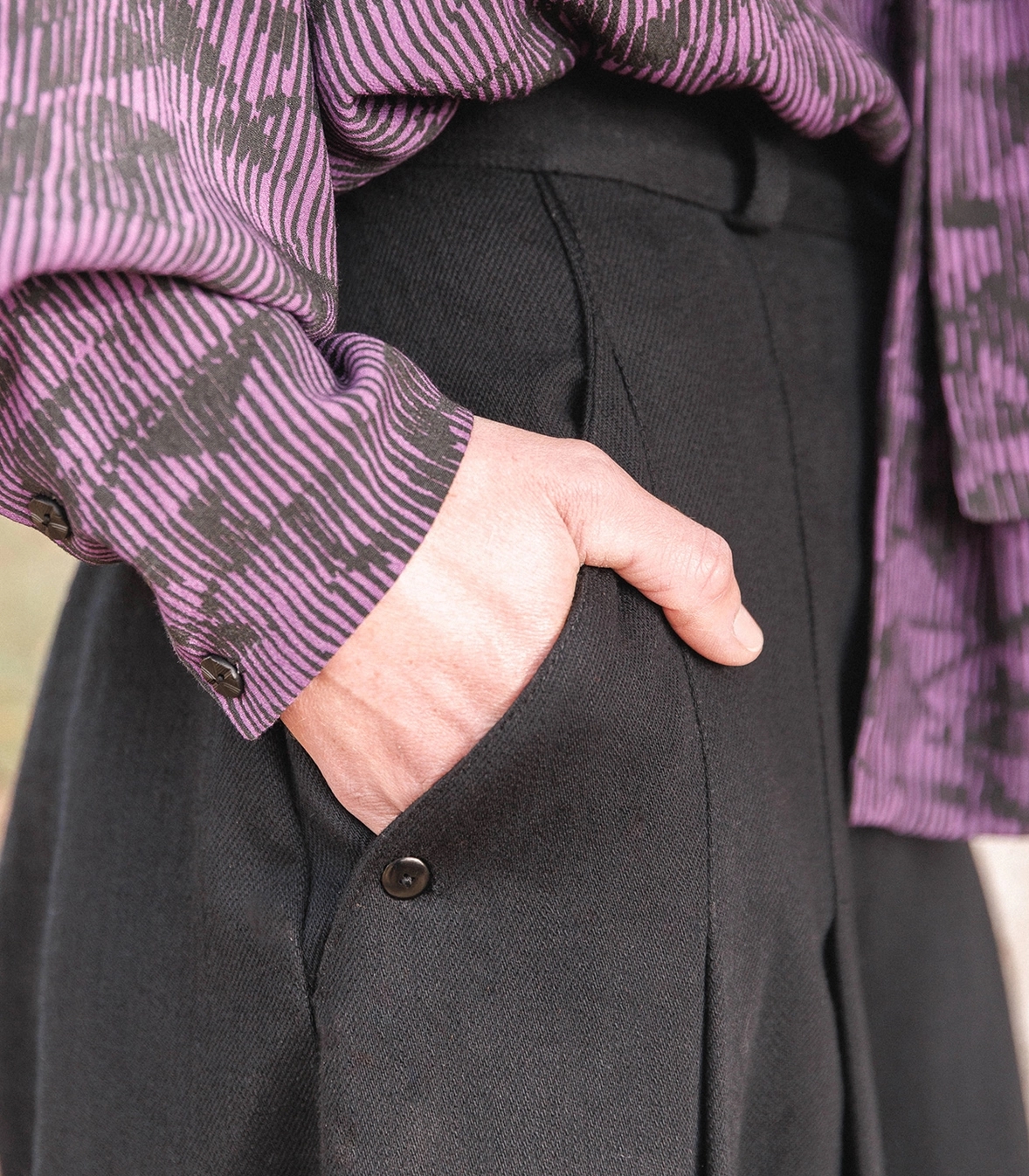 Buksenederdelen har en høj talje med linning, smukke faste læg foran, som giver flot vidde og fald, samt skrå sidelommer. Konstruktionen giver et eksklusivt, skræddersyet udtryk, hvor buksebenene visuelt ligner en nederdel, men med fuld funktionalitet som bukser.
