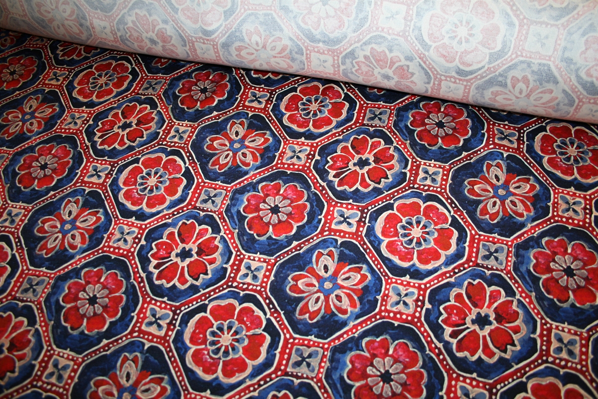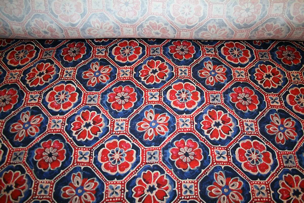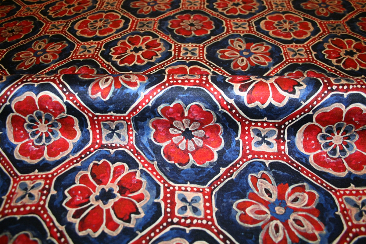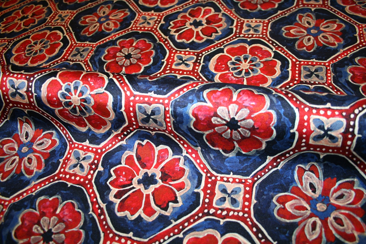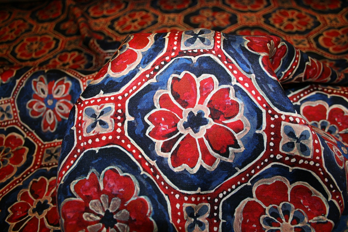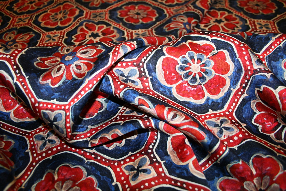 Deadstock uld -og silkeblanding med grafisk print i rød og blå