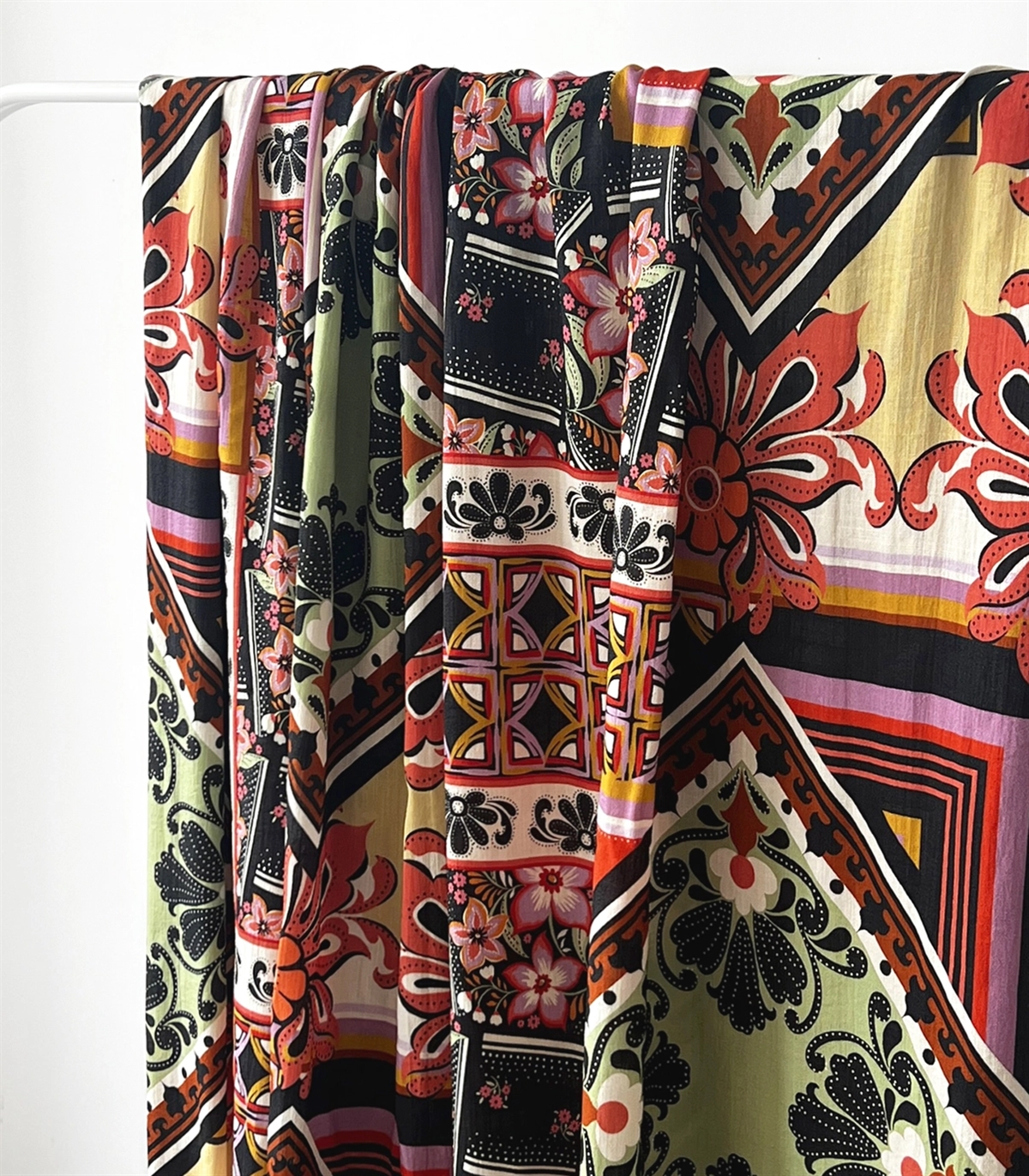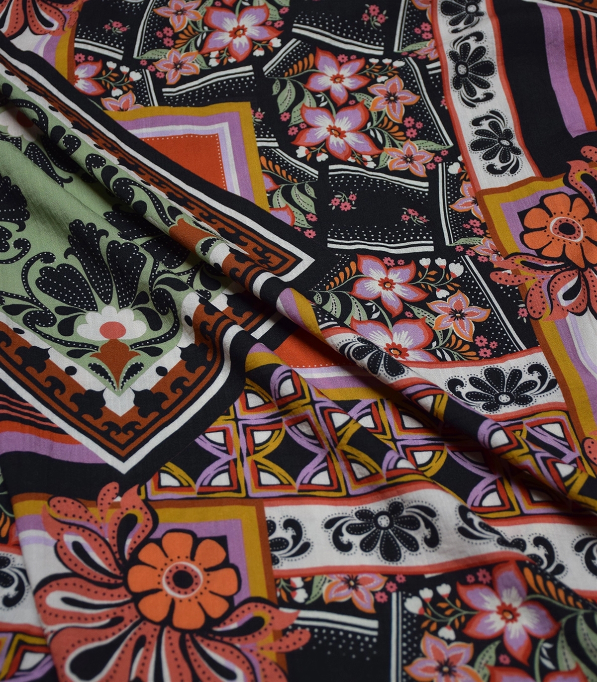 Crepevævet viskose med rustikke tern og blomstrede mønstre i varme nuancer. Kvaliteten er let og luftig.
