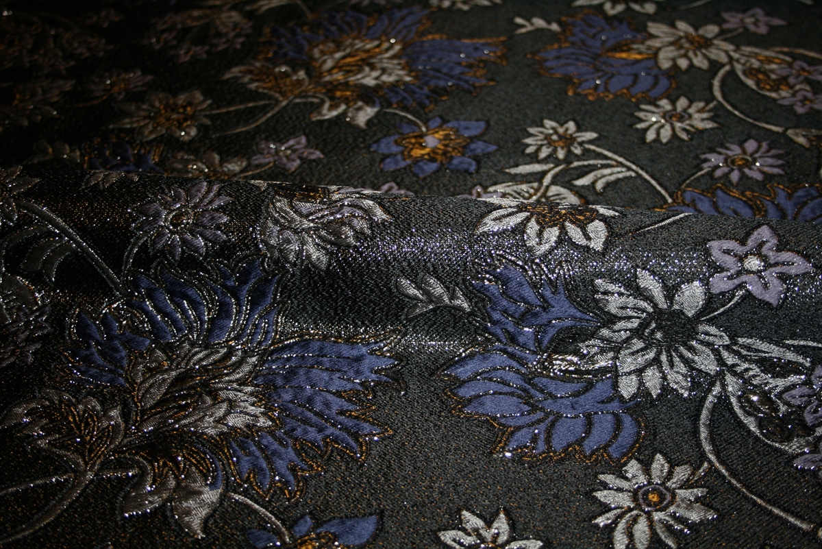 Dette eksklusive jacquardstof med let udstående blomsterdetaljer i blå, lavendel og grå på en sort bund. De lidt større tredimensionelle blomster løfter designet og giver en subtil struktur, der fanger lyset på smukkeste vis. Jacquardens unikke spil mellem glatte og strukturerede flader gør stoffet ideelt til jakker og nederdele eller eksklusive accessories med et couture-inspireret udtryk.