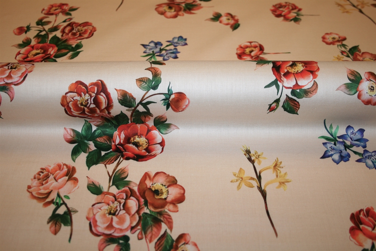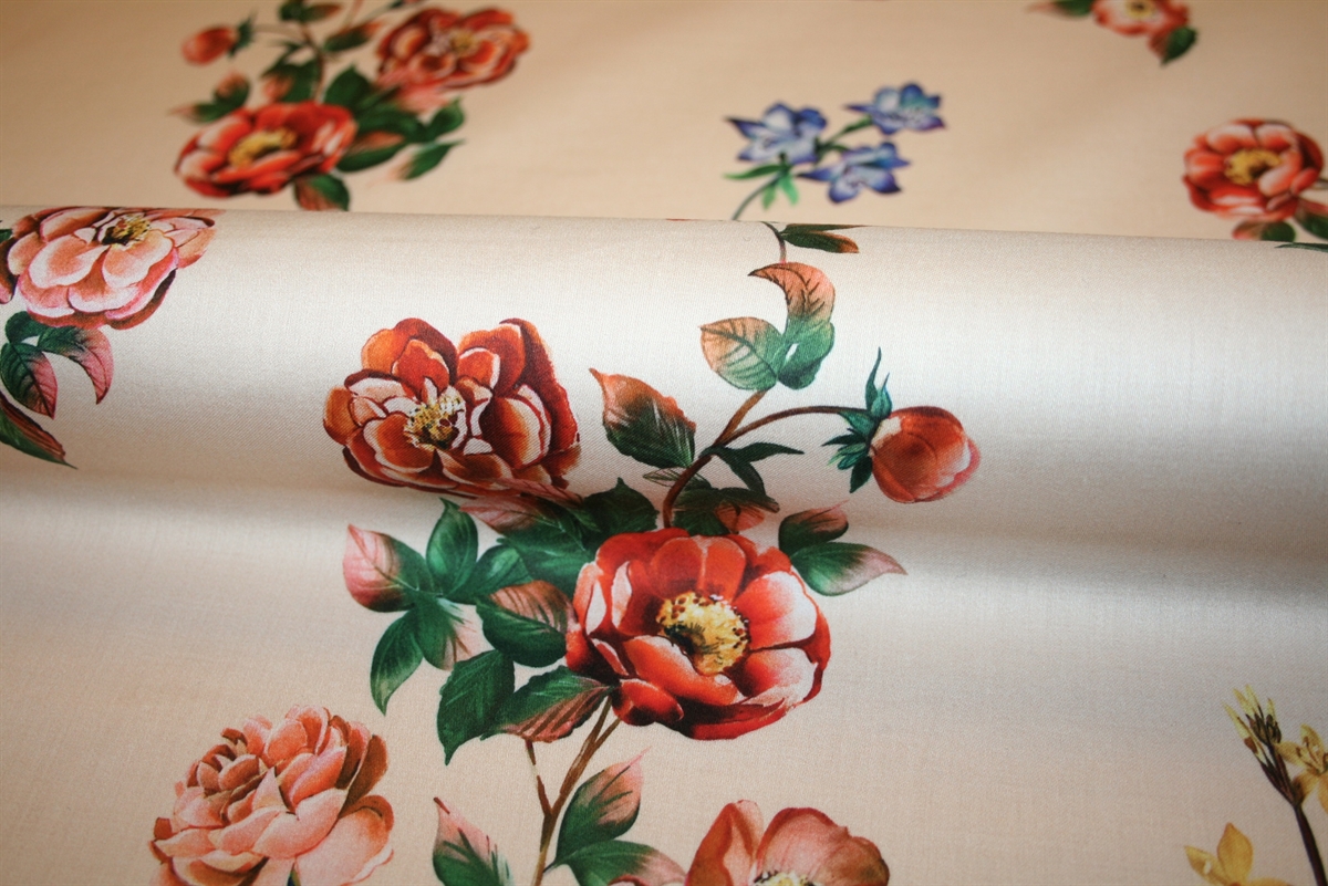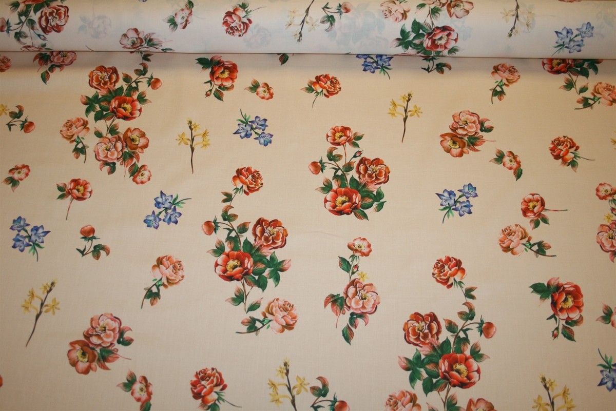 Eksklusiv bomuld i høj kvalitet med et elegant og feminint roselignende blomsterprint. Stoffet har en smuk, let blank overflade, som giver et sofistikeret udtryk. Den varme, lyse bund skaber en rolig base for de detaljerede blomster i nuancer af koral, rød, fersken og rosa, kombineret med dybe grønne blade og små petrolblå blomsteraccenter. Printet har et klassisk, næsten vintage-inspireret look, der balancerer mellem romantisk og moderne.