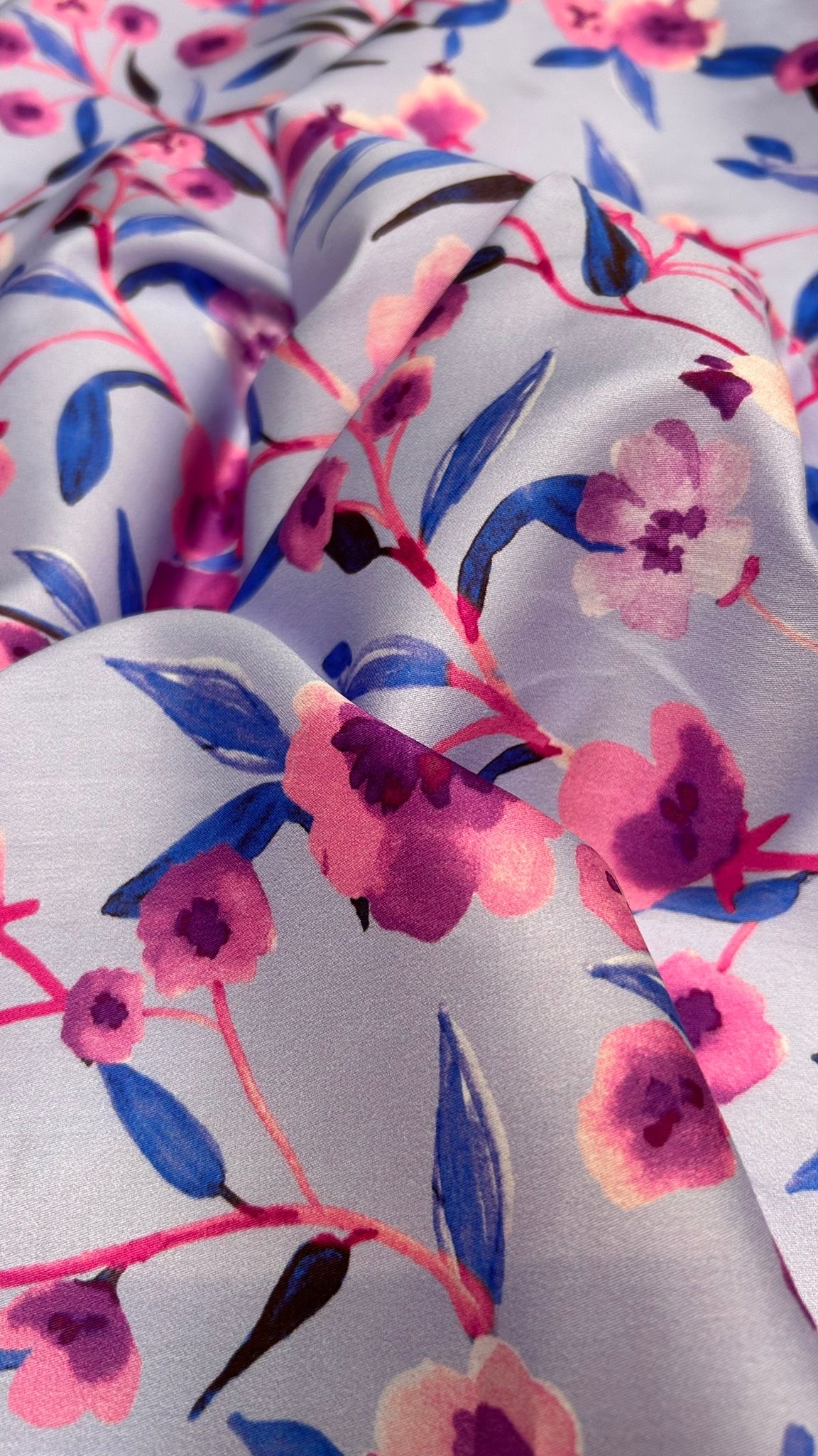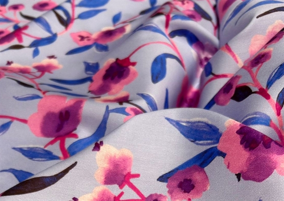 Lækker kvalitetsbomuld med et smukt blomsterprint på en lyselilla bund. Stoffet har en let satineret finish og kvaliteten er let og blød og giver sig en smule på tværs. Stoffet er produceret for Gai Mattiolo.