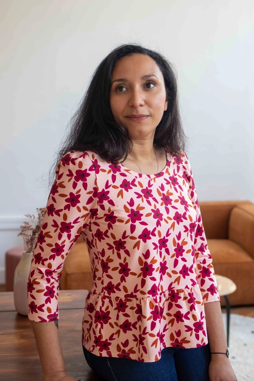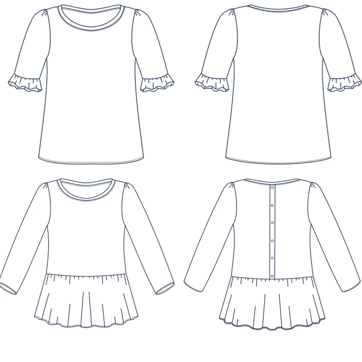 Frimas giver dig mulighed for at sy flere forskellige modeller ud fra ét mønster. Designet har en klassisk, rund halsudskæring og en let, afslappet pasform, som gør det behageligt at have på i hverdagen. Modellen kan syes med eller uden det tilrynkede peplum skørt og knaplukning i ryggen. Du kan vælge mellem korte ærmer med flæsedetalje eller lange ærmer.