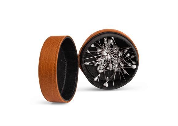 Lille rund læderæske fra Muud designet til den kræsne skaber, der elsker at holde nåle, fingerbøl, perler, knapper osv. pænt organiseret. De små genstande og tilbehør, der ellers ofte bliver væk – enten derhjemme eller når du tager dine kreative projekter med på farten. Æsken lukkes med et lille låg, der placeres ovenpå æsken uden lynlås. Æskens sider er faste, hvilket gør den ideel til opbevaring af smykker eller andre småting. Bunden af æsken er magnetisk, hvilket gør det lettere at holde dine nåle på plads.