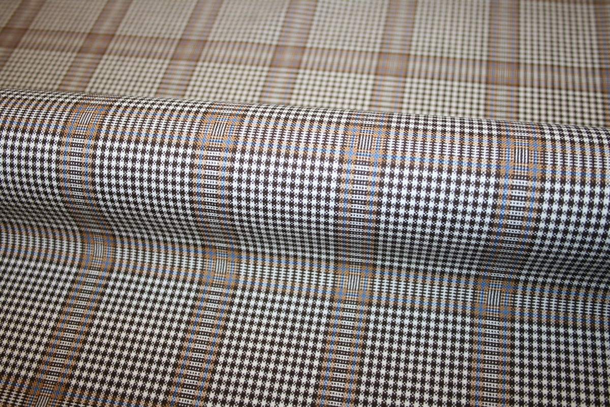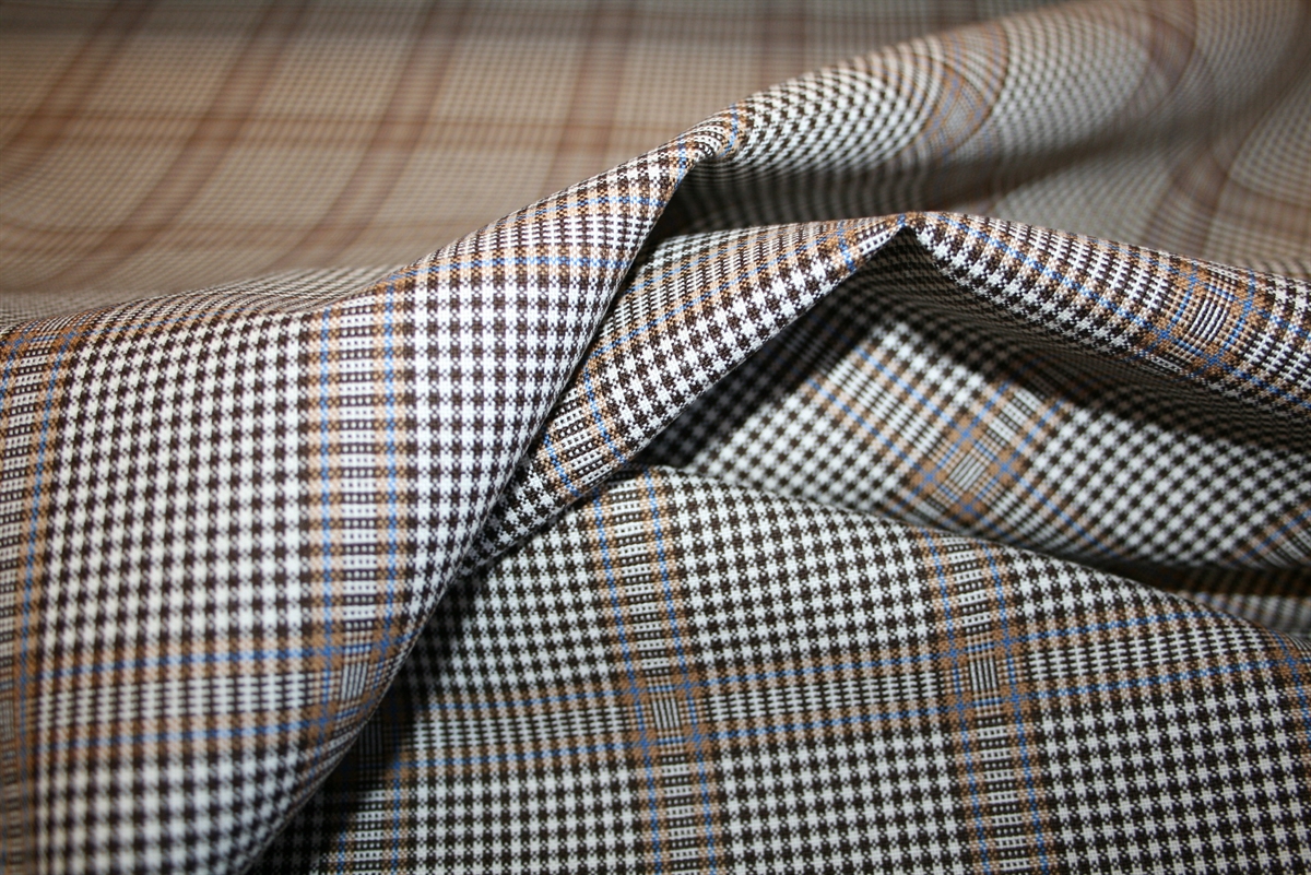 Dette smukke stof er vævet i 100% ren uld af højeste kvalitet og har et klassisk ternet mønster i sort, hvid, brun og blå nuancer. Kombinationen af de skarpe kontraster og den elegante blå detalje giver stoffet et moderne og herreinspireret udtryk. Stoffet er slidstærkt, åndbart og behageligt at have på, hvilket gør det ideelt til skræddersyede bukser, blazere, nederdele eller kjoler.
