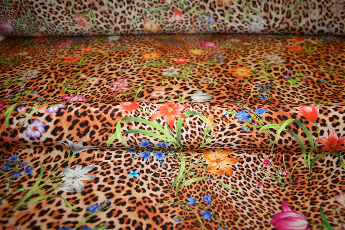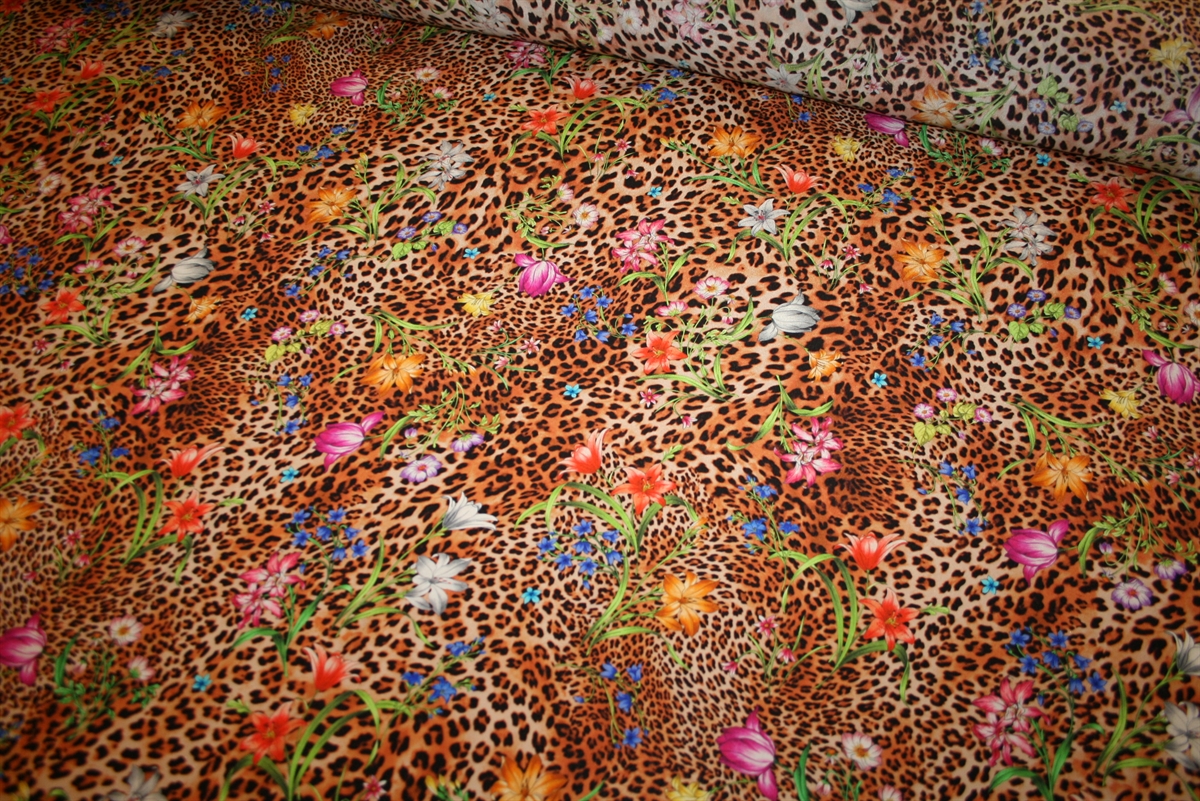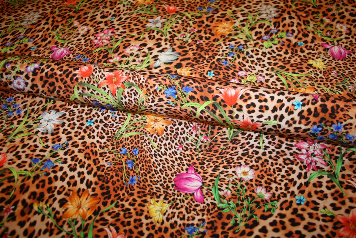 Eksklusivt silkestof med leopardprint og blomsterdetaljer