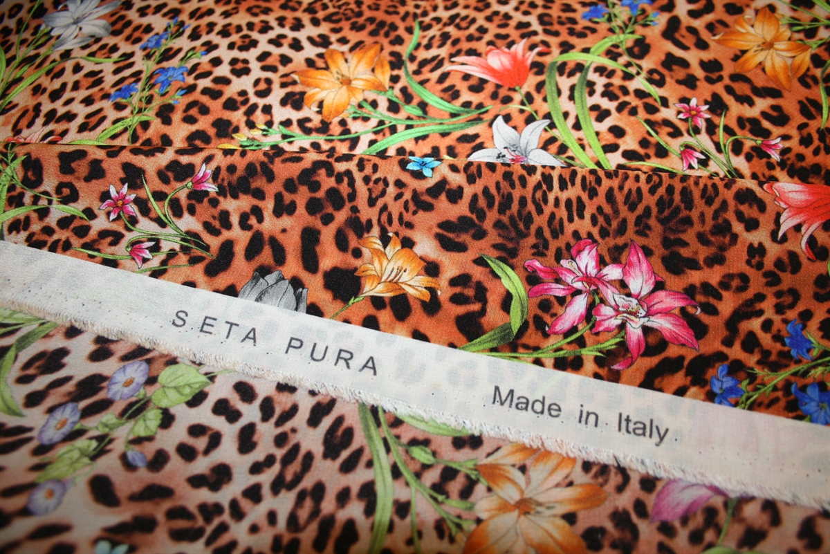 Eksklusiv deadstock silke med leopard -og blomsterprint. Silken giver sig let på tværs. Stoffet er produceret for Ferragamo.