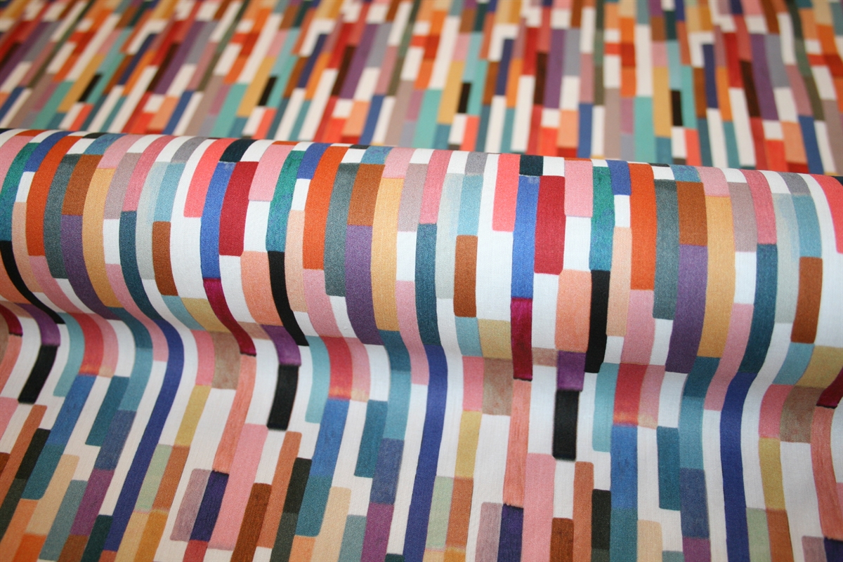 Maksimus er et unikt Liberty-stof, hvor farve og struktur mødes i et iøjnefaldende geometrisk mønster. Printet består af rektangulære blokke i kontrasterende og komplementære nuancer, oprindeligt inspireret af håndmalede farveprøver fra Liberty-arkivet. Disse små malede farvefelter blev tidligere anvendt som referencepaletter i kunstneriske værker – nu gentænkt som et moderne tekstildesign.