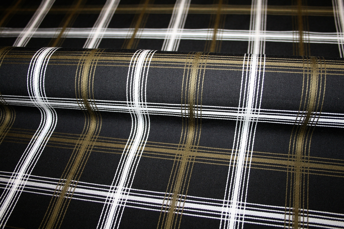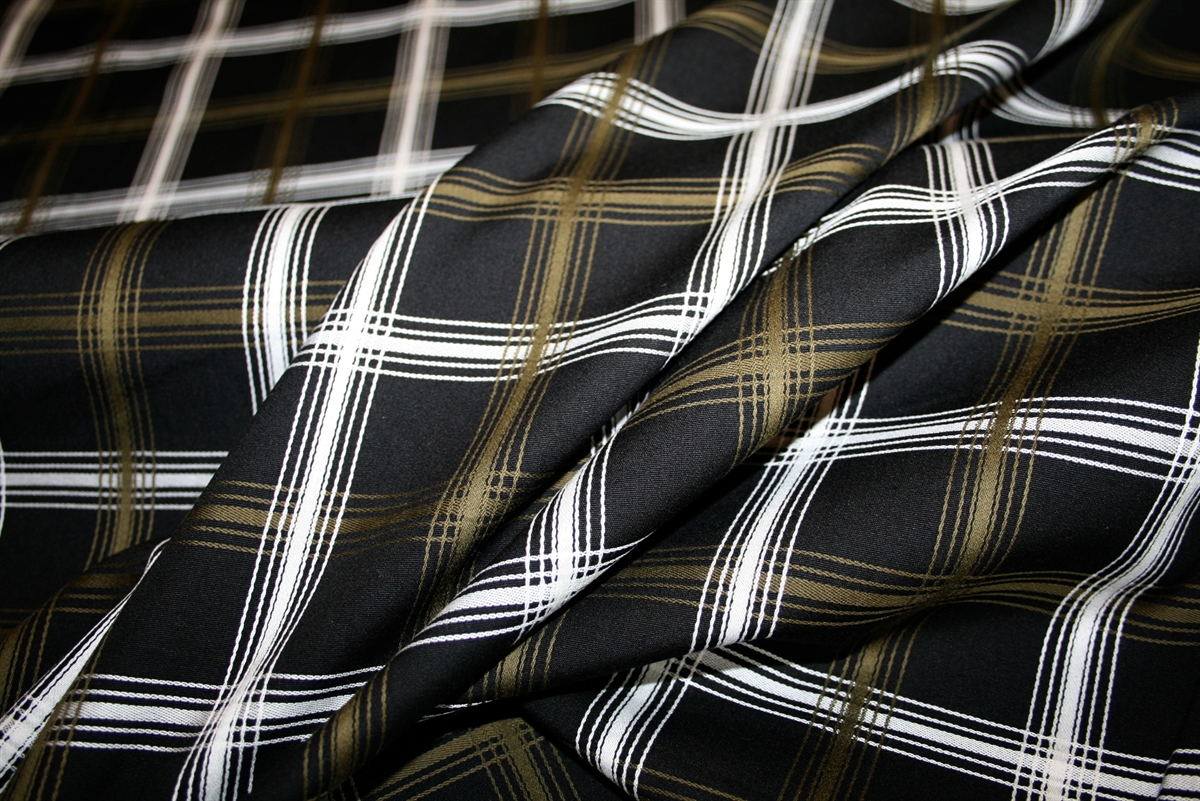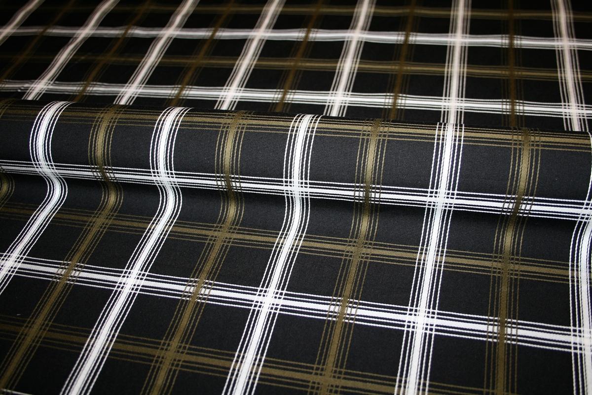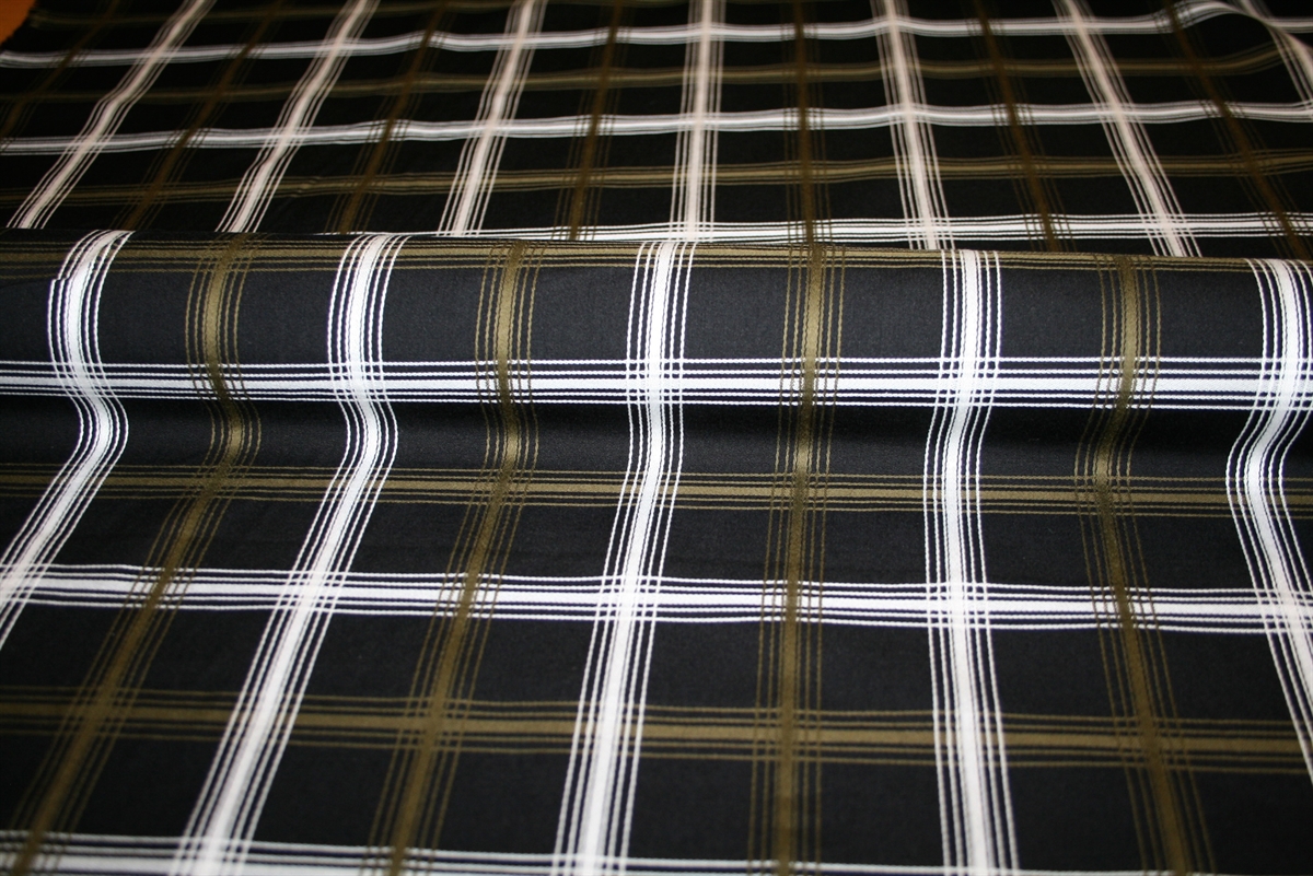 Jacquardvævet bomuld med olivengrønne og hvide tern på en sort bund. Kvaliteten er lettere og forholdsvis blød. Stoffet er deadstock fra italiensk modehus.