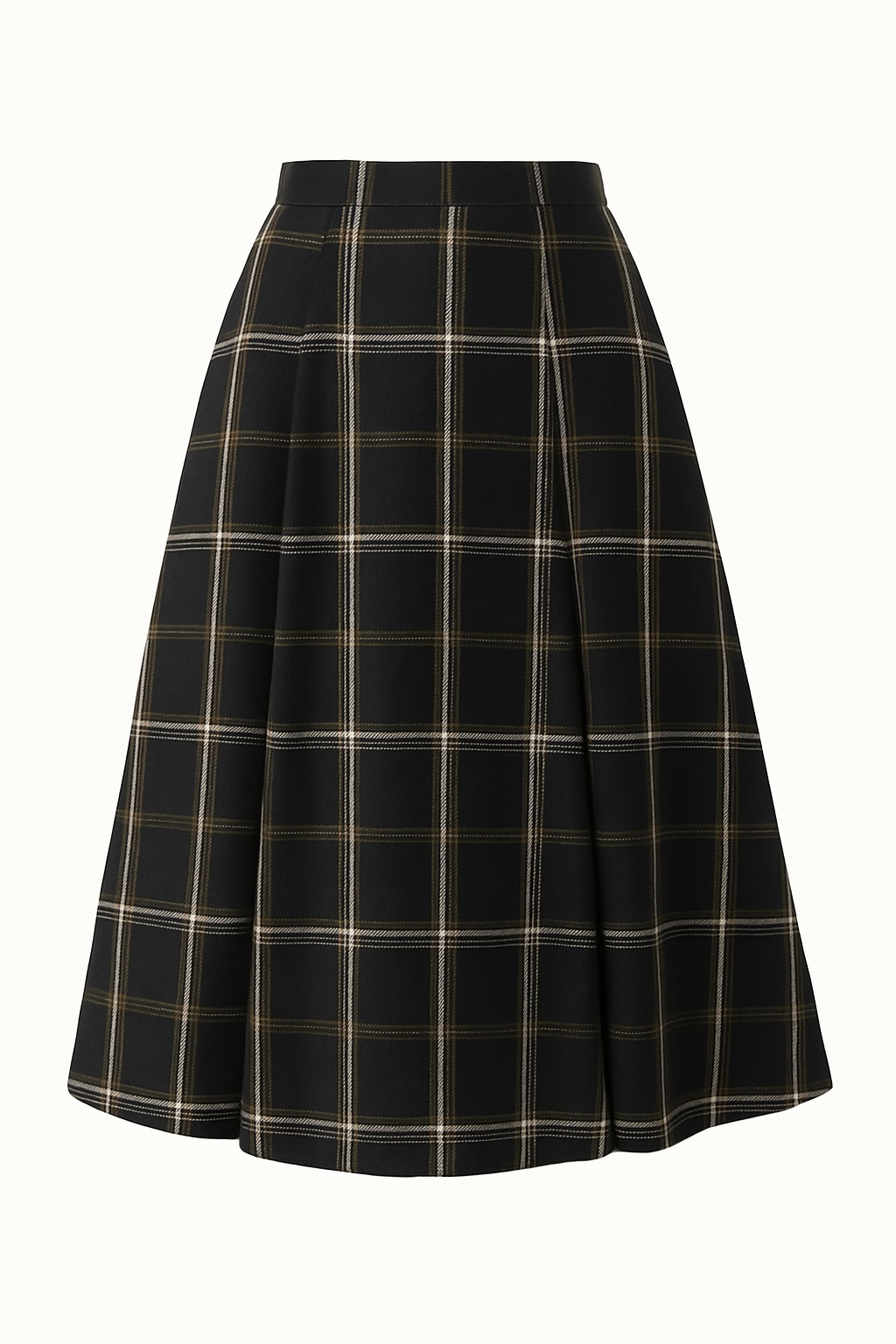 Du finder i billedserien en AI generet model af en nederdel i midi længde med to dybe læg og en fast lining. På den måde er det lettere at forestille sig udtrykket i et færdigt stykke tøj. Til en model som den på billedet skal der bruges mellem 2 og 3 meter stof. Du kan med fordel foere nederdelen.