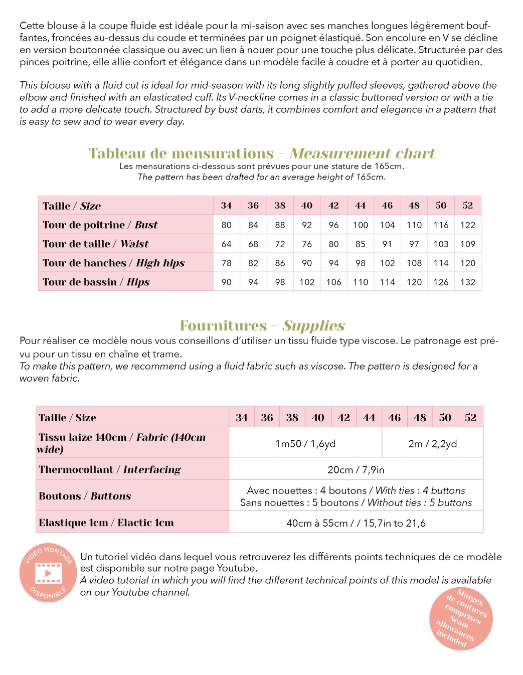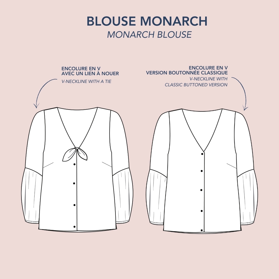 Monarch er et smukt og tidløst blusemønster med et let, flydende snit, der gør den ideel til overgangssæsoner som forår og efterår. Designet er struktureret med brystindsnit, som giver en flot pasform, samtidig med at blusen bevarer sin komfortable og afslappede silhuet. Designet har en smuk V-udskæring, som kan sys i to udgaver: enten en klassisk version med knaplukning eller en mere feminin variant med bindebånd, der tilfører et blødt og delikat udtryk. De lange, let puffede ærmer er smukt rynket over albuen og afsluttes med elastikmanchetter.