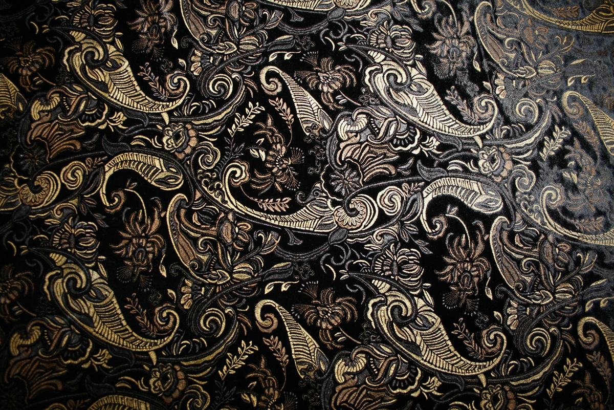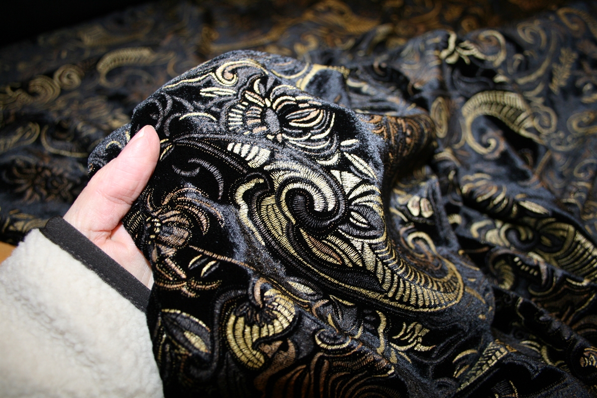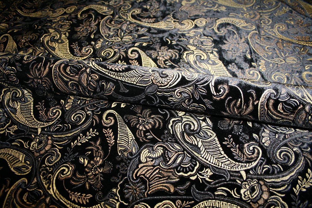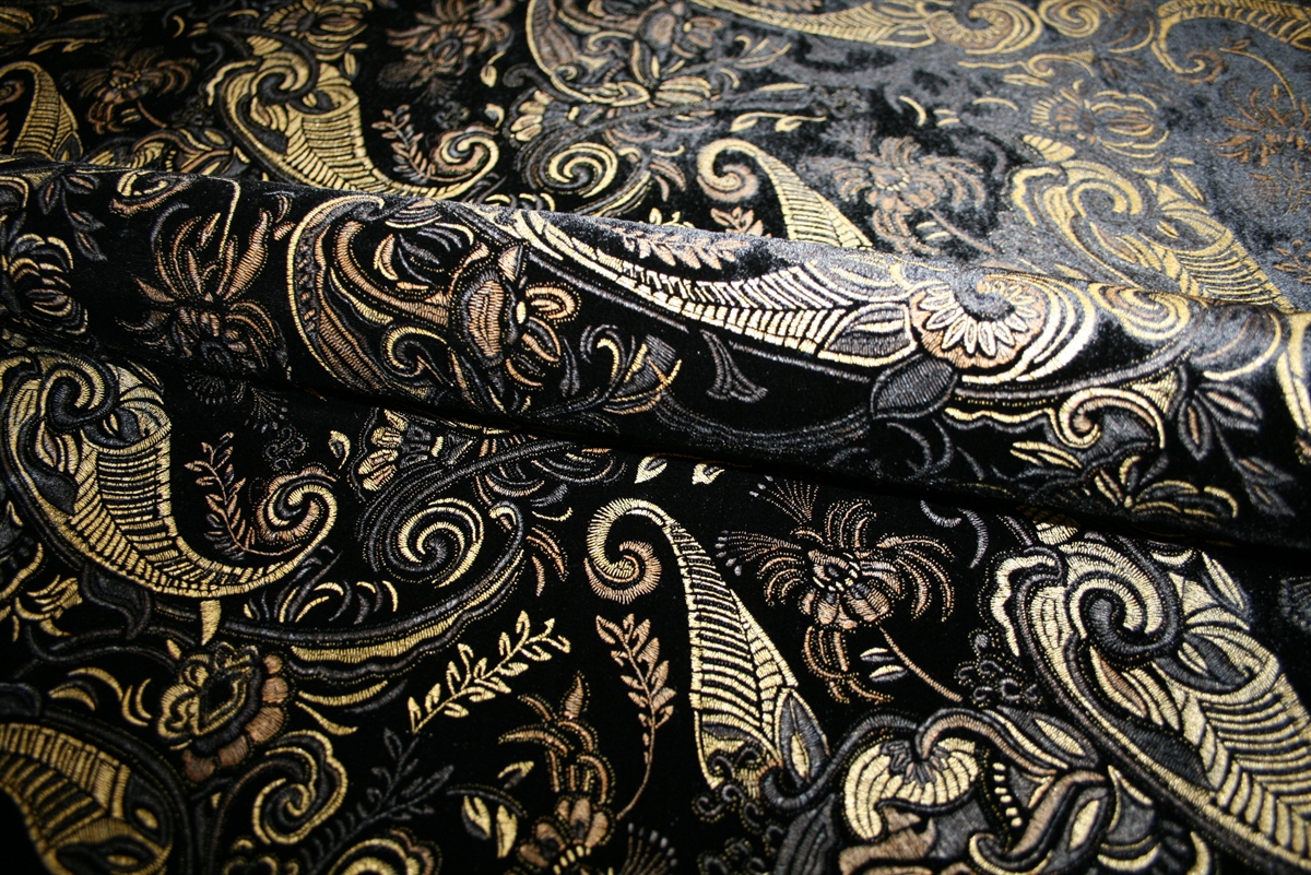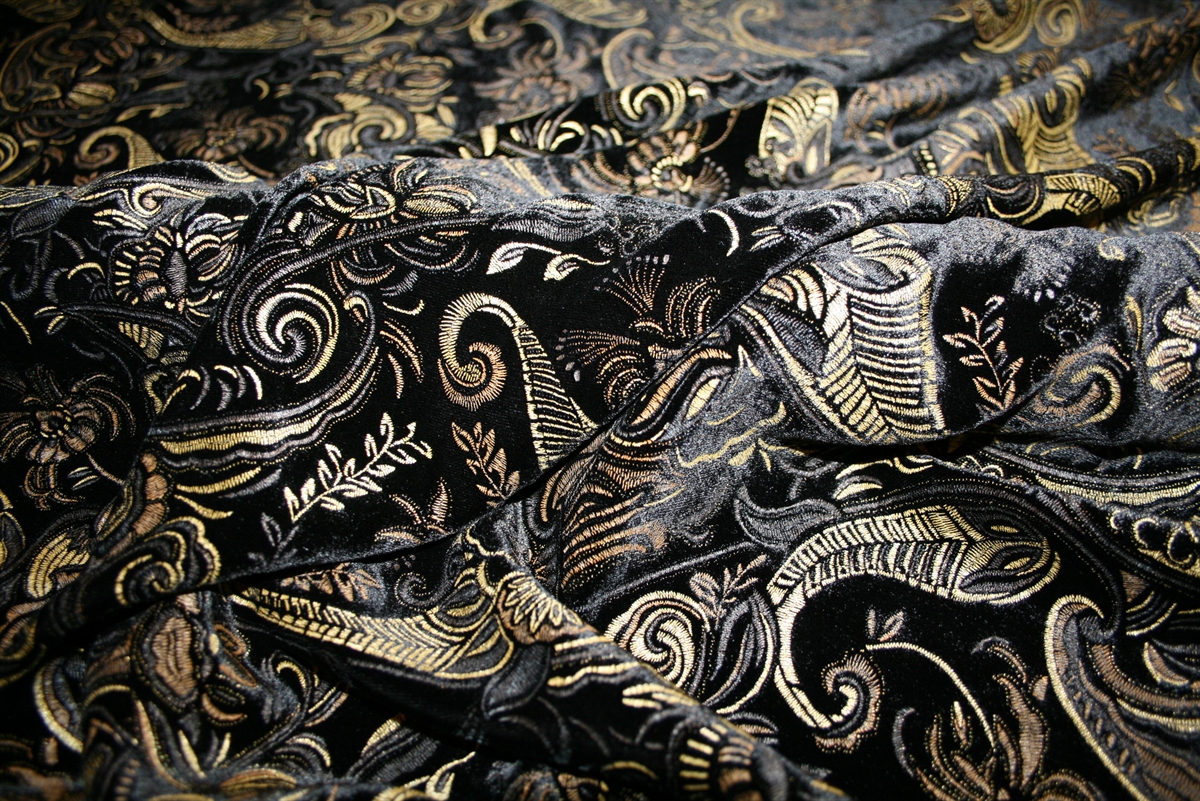 Meget smuk og unik sort velour med gyldent tryk. Kvaliteten er blød, levende og let-medium kraftig. Stoffet er produceret for et stort modehus.