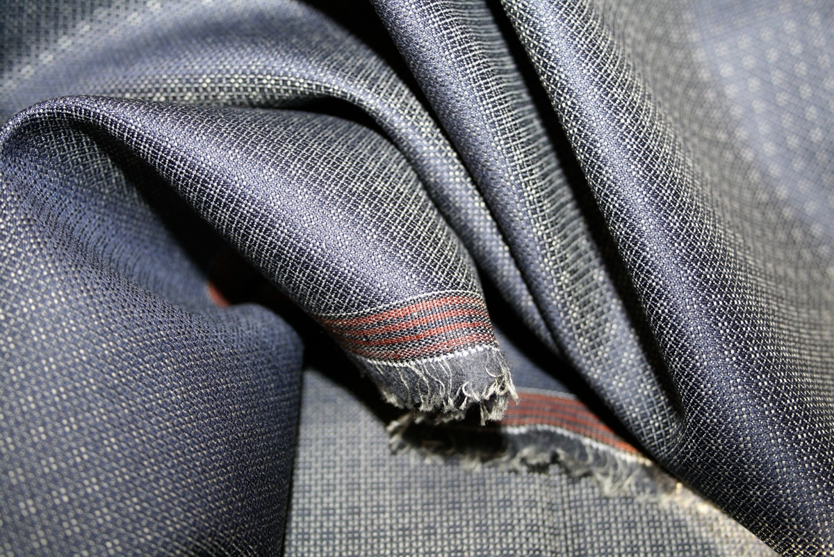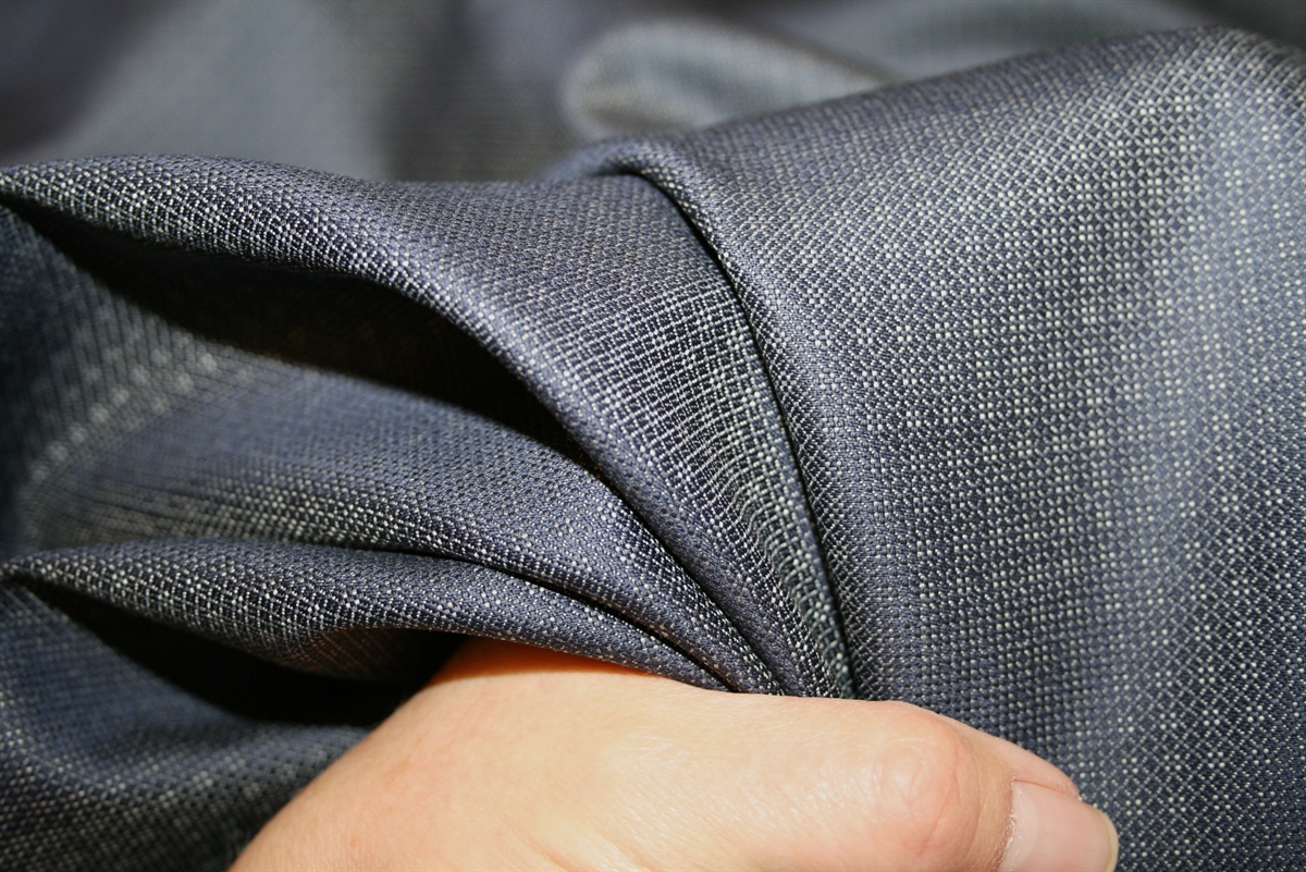 Jacquardvævet uld -og viskoseblanding i en let, glansfuld og lækker italiensk kvalitet. Stoffet er vævet i hhv. blå og grå, hvilket giver et smukt spil.