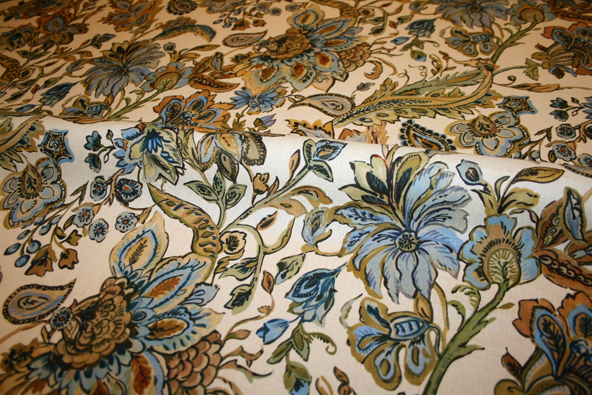 Et karakterfuldt og levende hørstof med et rigt og detaljeret print bestående af blomster, slyngende ranker og paisley-inspirerede elementer i nuancer af mosgrøn, brun og blå på en creme bund.