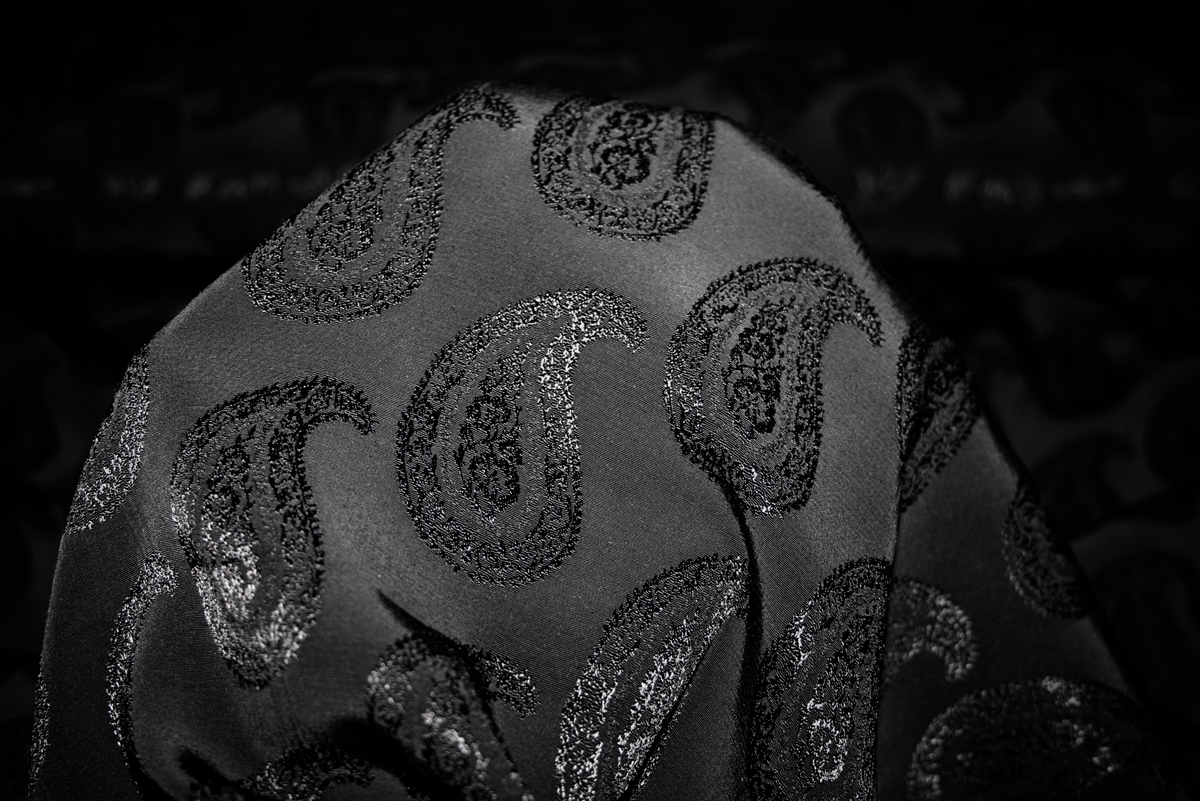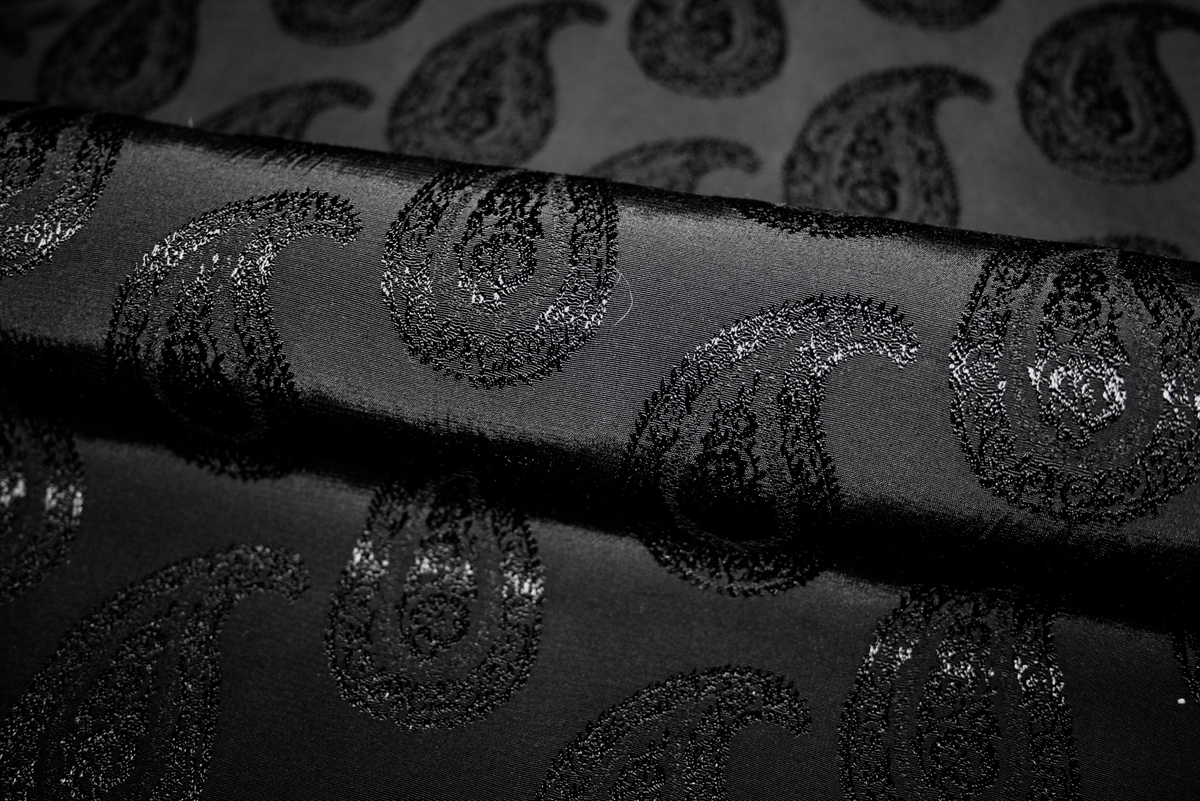 Elegant sort jacquardvævet viskose med et smukt dråbeformet sjalsmønster. Kvaliteten er let-medium kraftig og glansfuld. Perfekt til en festlig anledning.