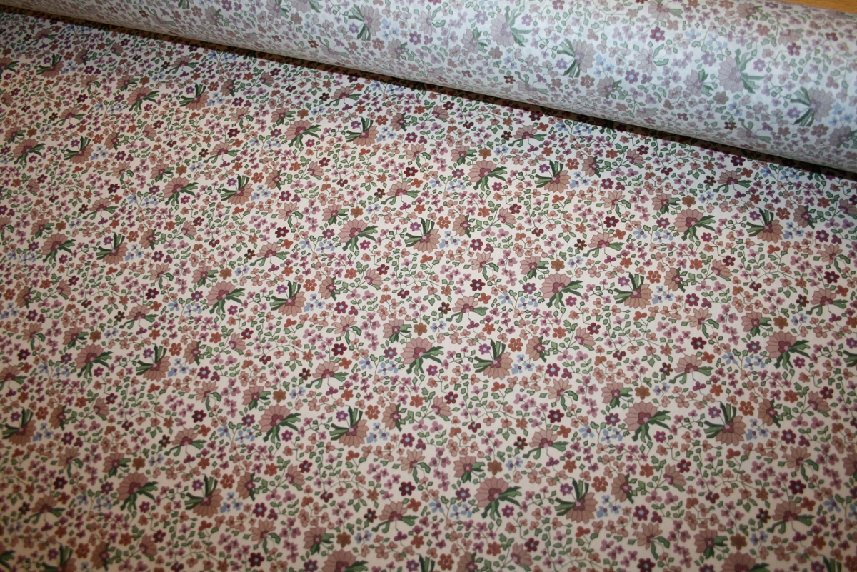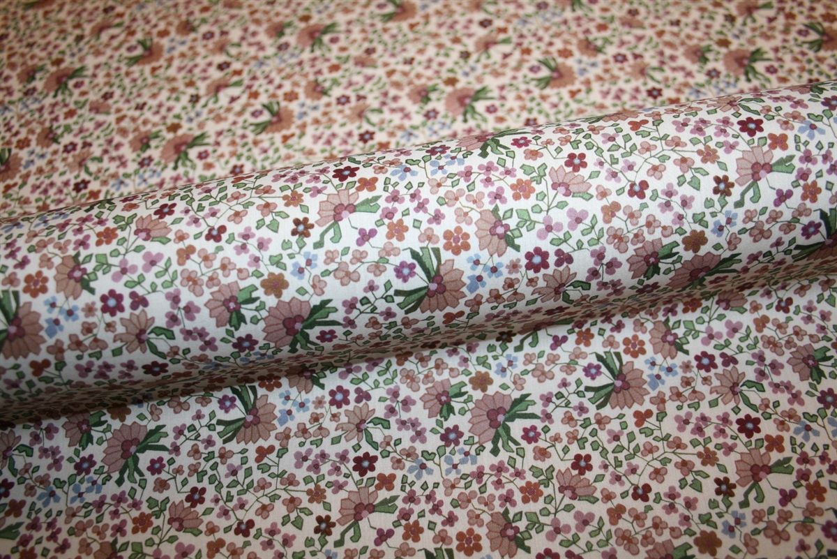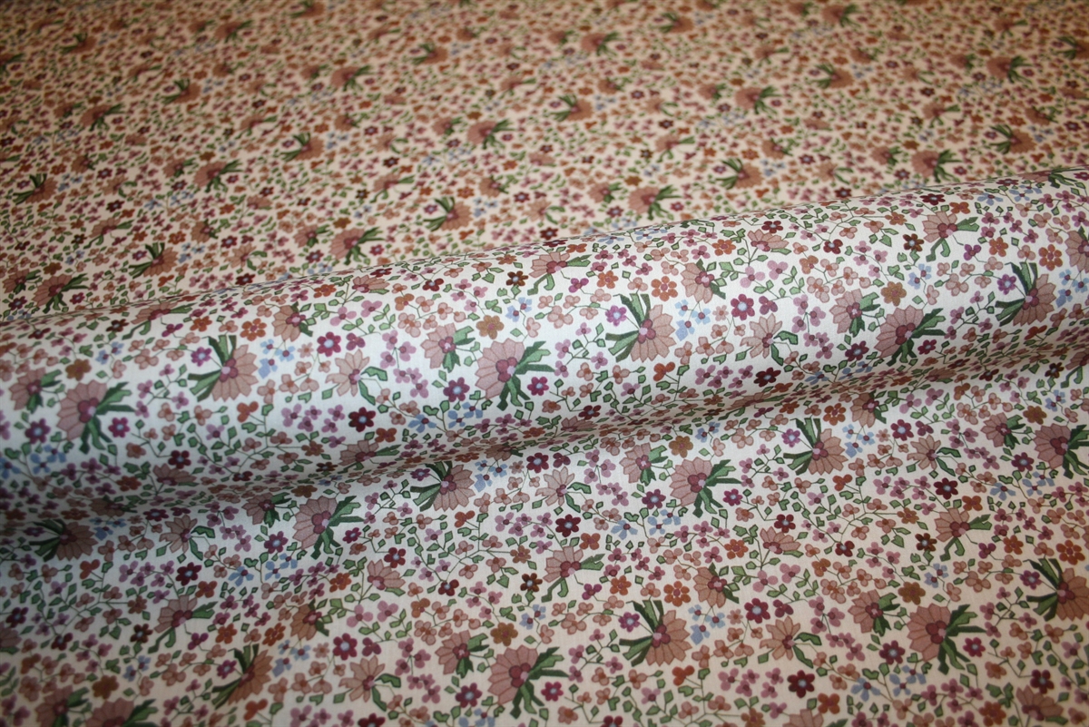 Liberty Tana Lawn™ i 100% bomuld med et klassisk og charmerende print fyldt med små, detaljerede blomster i varm rosa, violet, lyseblå og grønne nuancer.