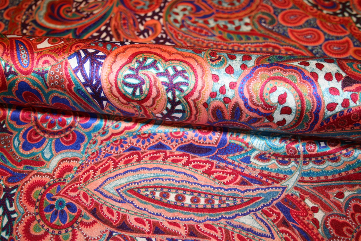 Blød silkesatin med et smukt fald og paisley print i varme nuancer. Stoffet er produceret for Etro.