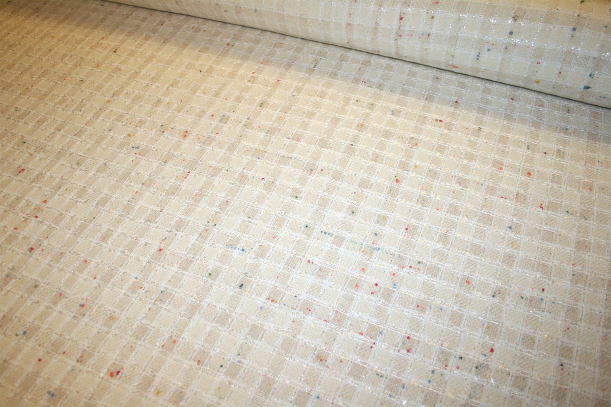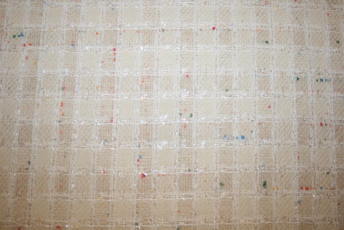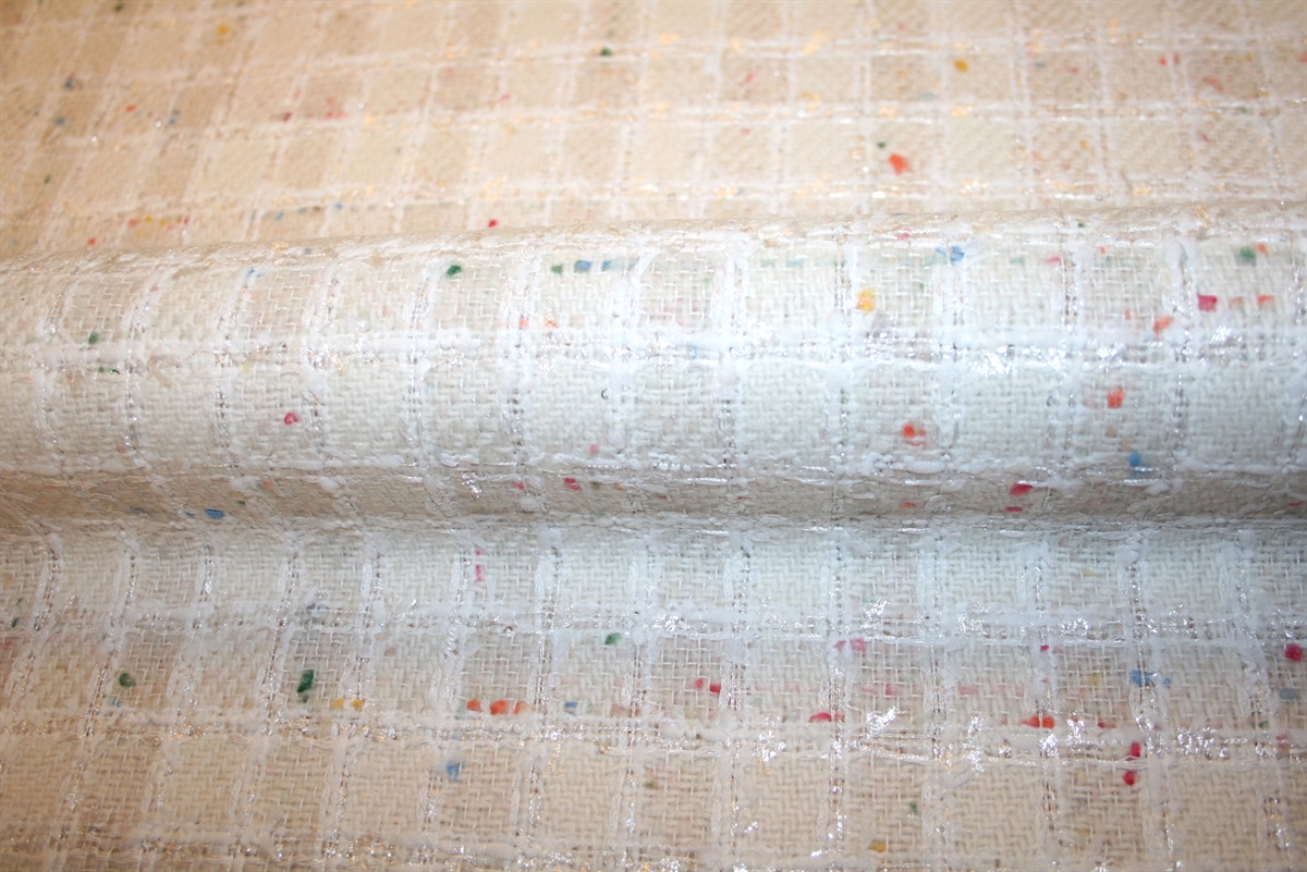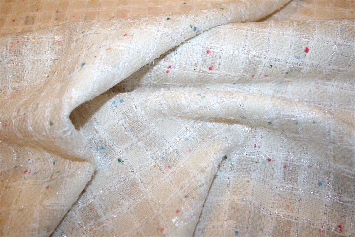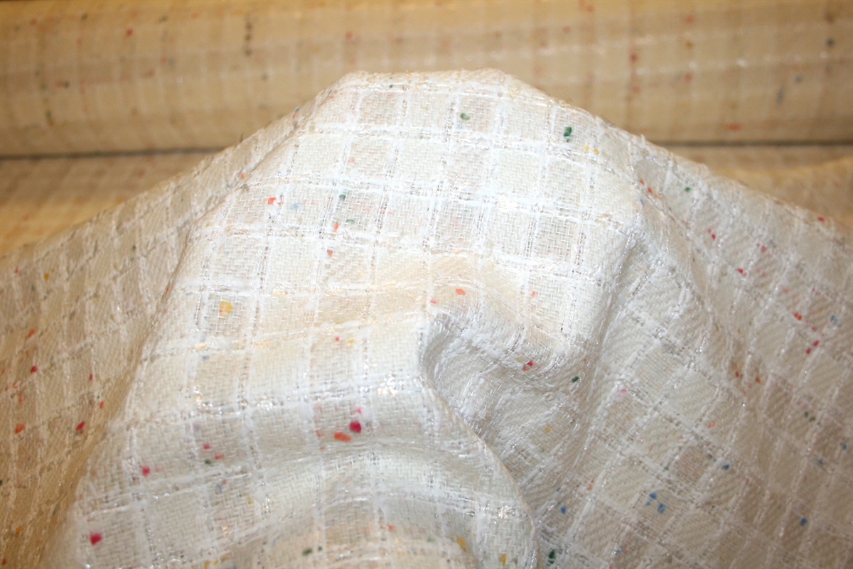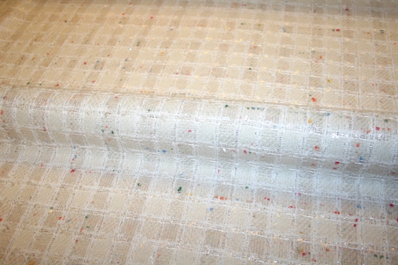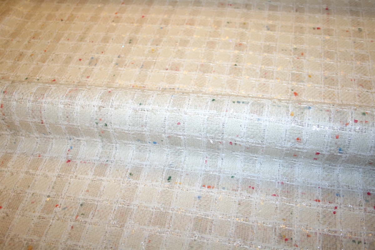 Cremehvid bouclé med skinnende kvadratiske tern og farvede nister. Kvaliteten er blød og medium kraftig. Stoffet er produceret for internationalt modehus.