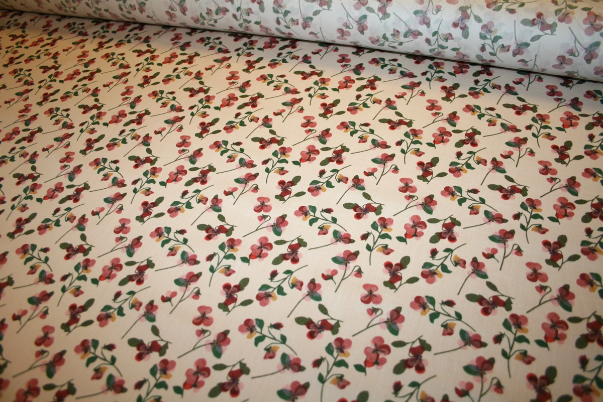 Liberty Tana Lawn™ i 100% bomuld med små spredte stedmoderblomster i nuancer af bordeaux, lyserød, okker og grøn på en blød sandfarvet bundtone.