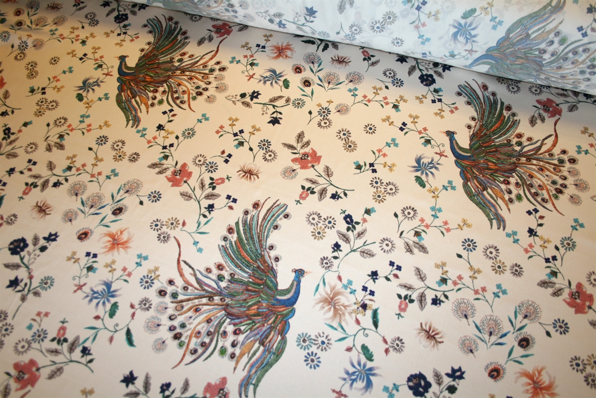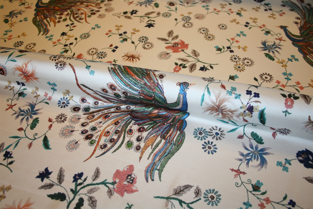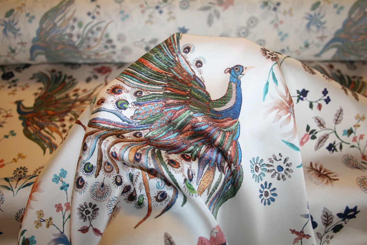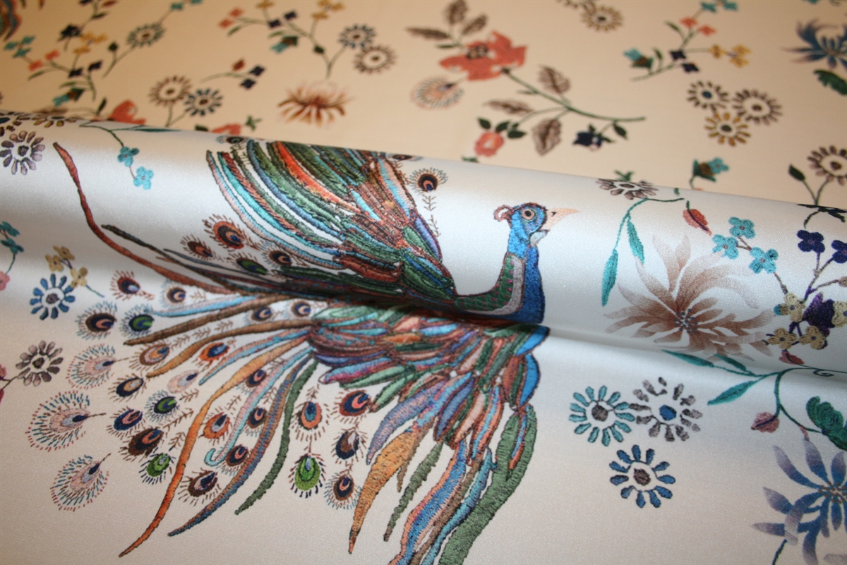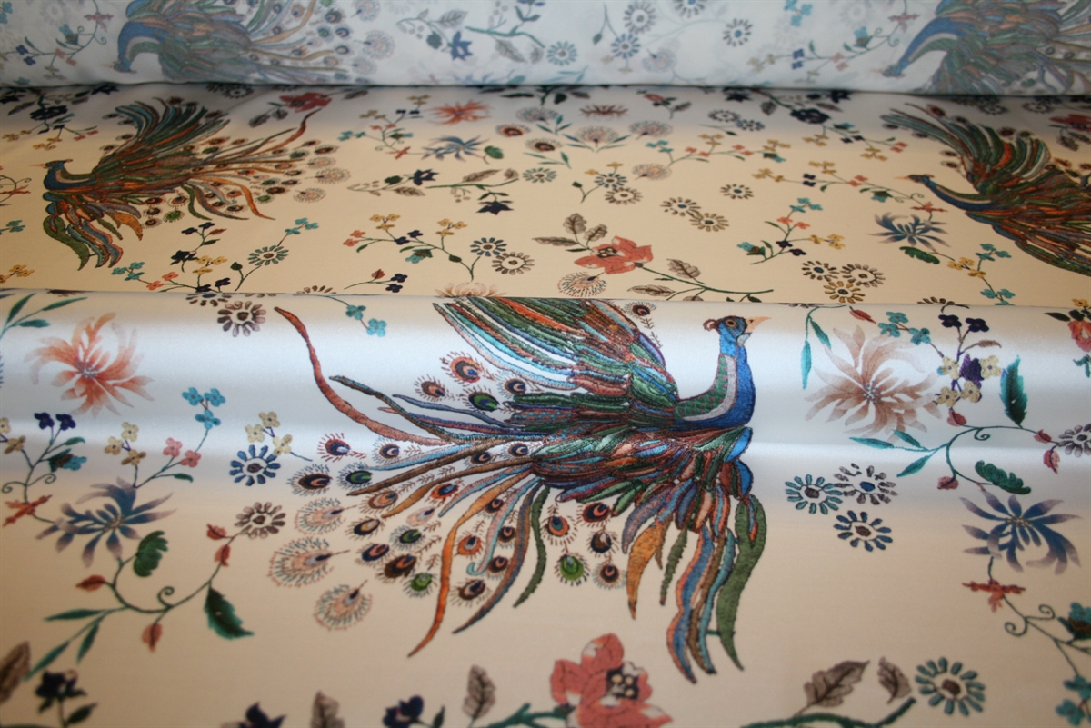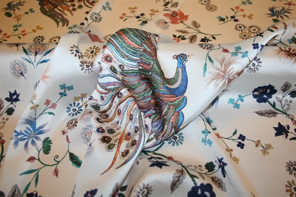 Satinvævet viskoseblanding med et smukt påfugle-print på en cremefarvet bund. Kvaliteten er let sprød. Stoffet er produceret for et internationelt modehus.