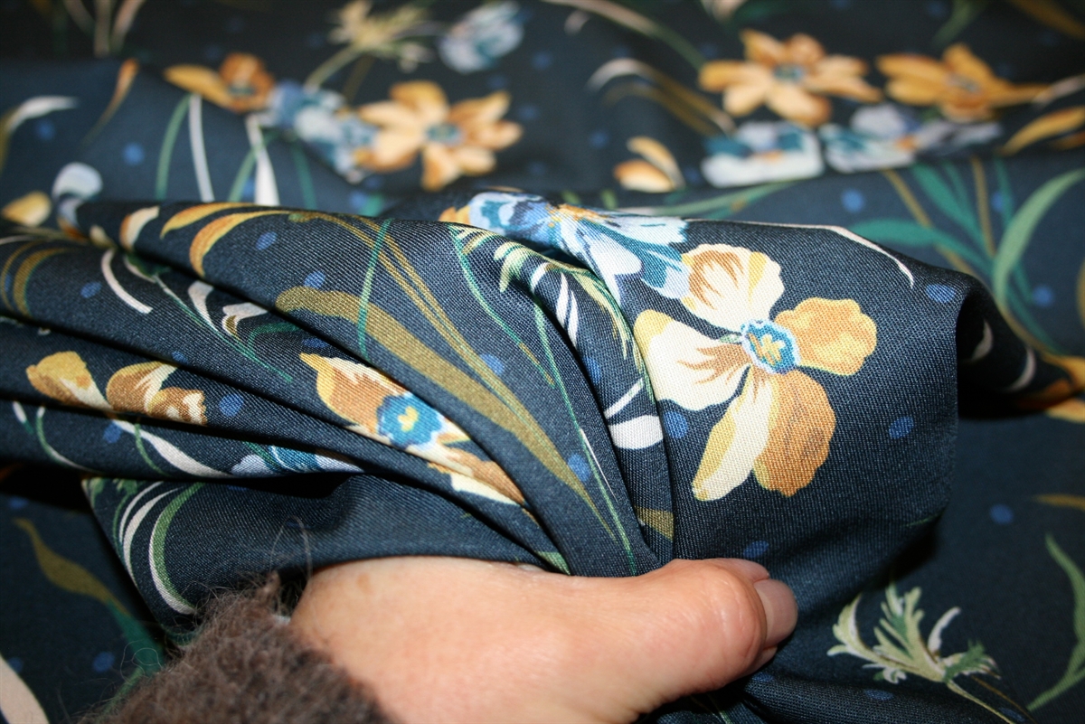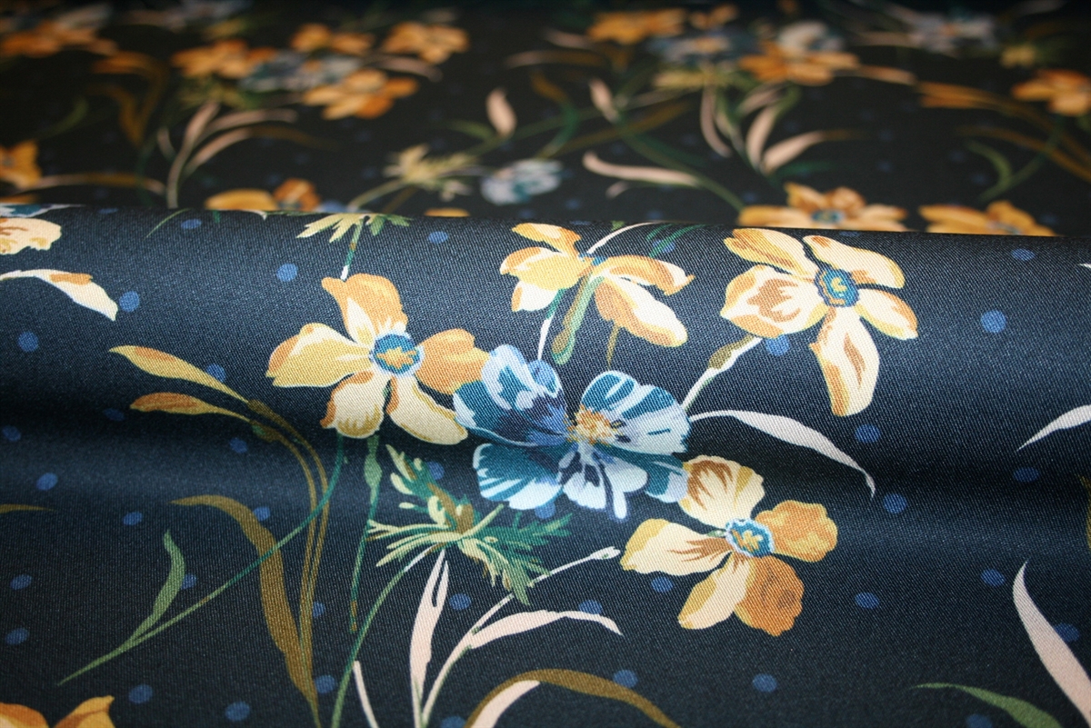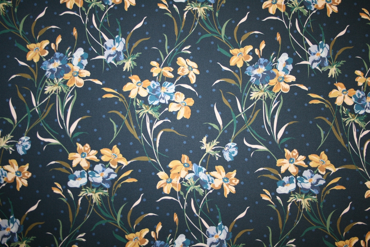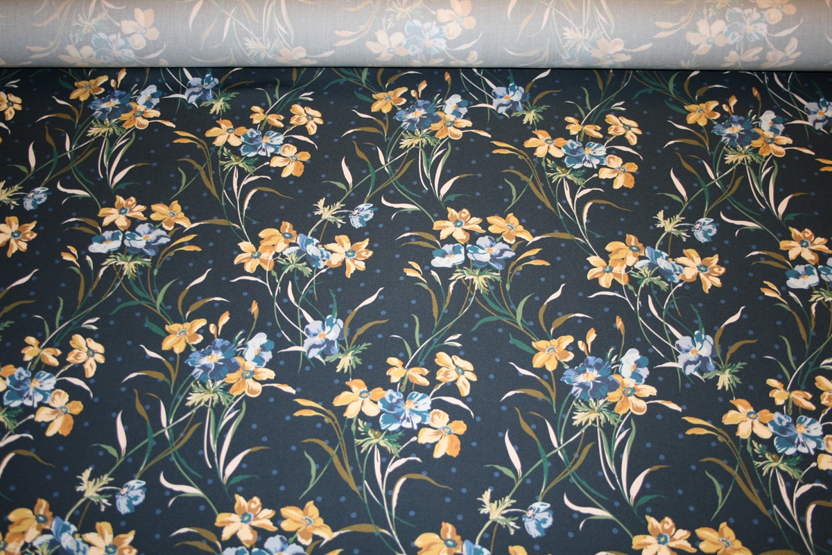 Twillvævet 'Weymouth' viskose med et smukt blomsterprint og prikker på en mørkeblå bund. Sublim kvalitet fra Liberty Fabric.