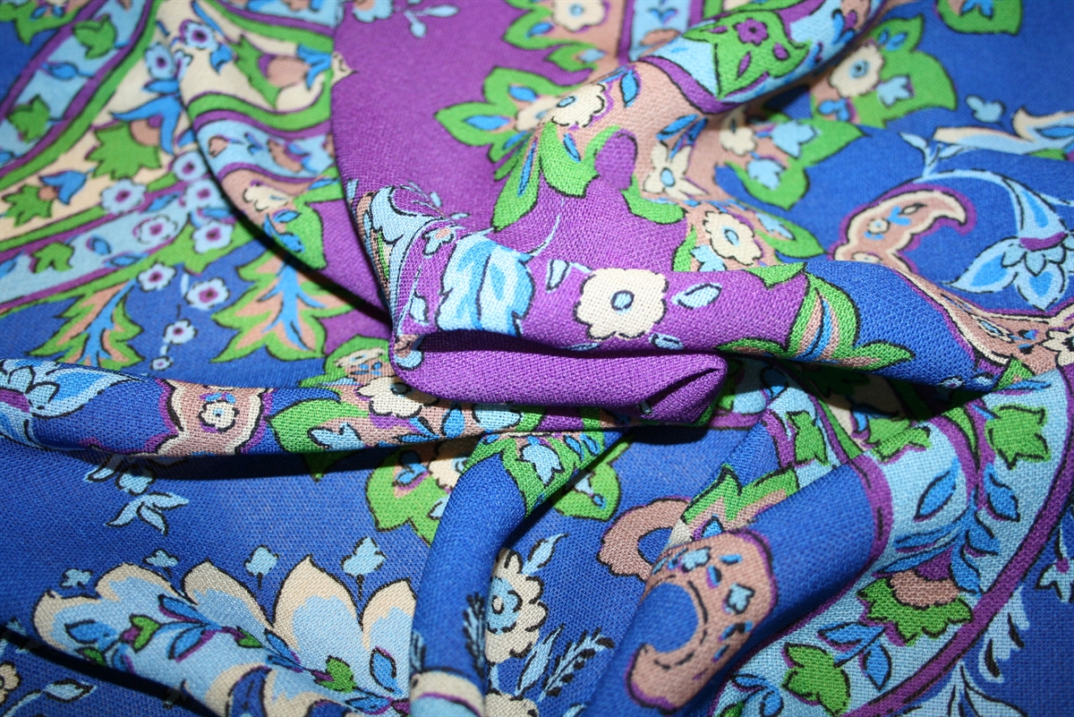Let og luftig uld -og silkeblanding til tørklæde. På stoffet er et større paisley print i klare farver omkranset af en navy bort. Stoffet er produceret for Etro. Stykket måler ca. B130*H140 cm.