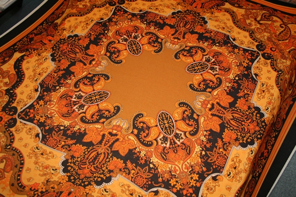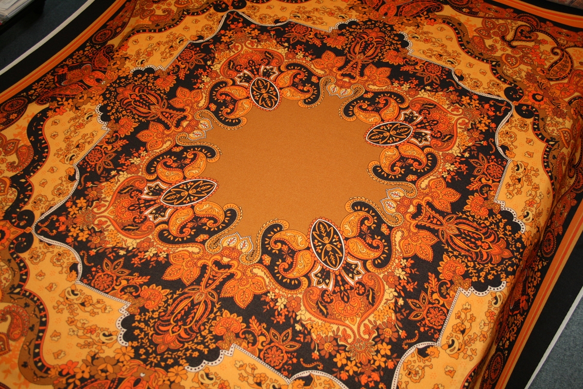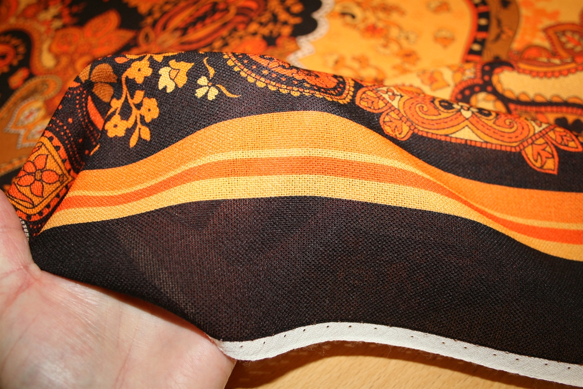 Let og luftig uld -og silkeblanding til tørklæde. På stoffet er et detaljeret paisley inspireret print i varme nuancer af karamel, cognac og orange. Stoffet er produceret for Etro. Stykket måler ca. 134*134 cm.