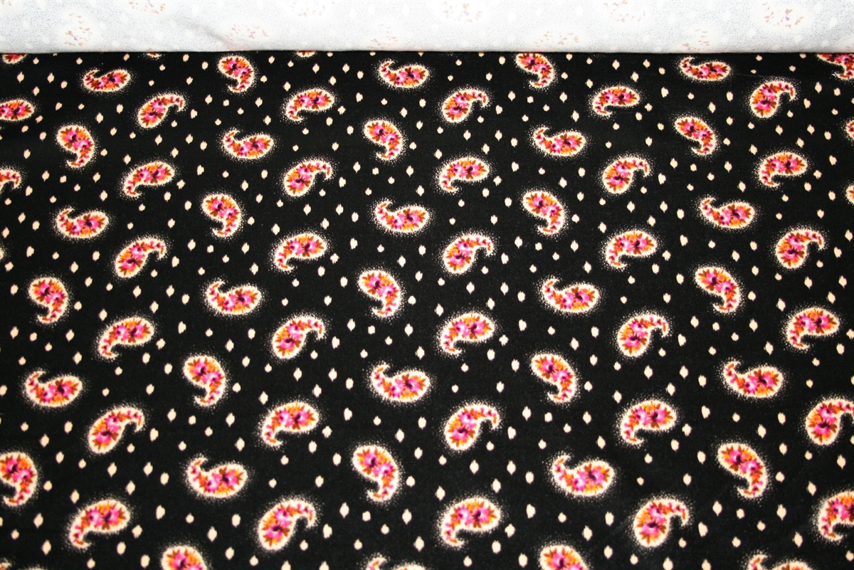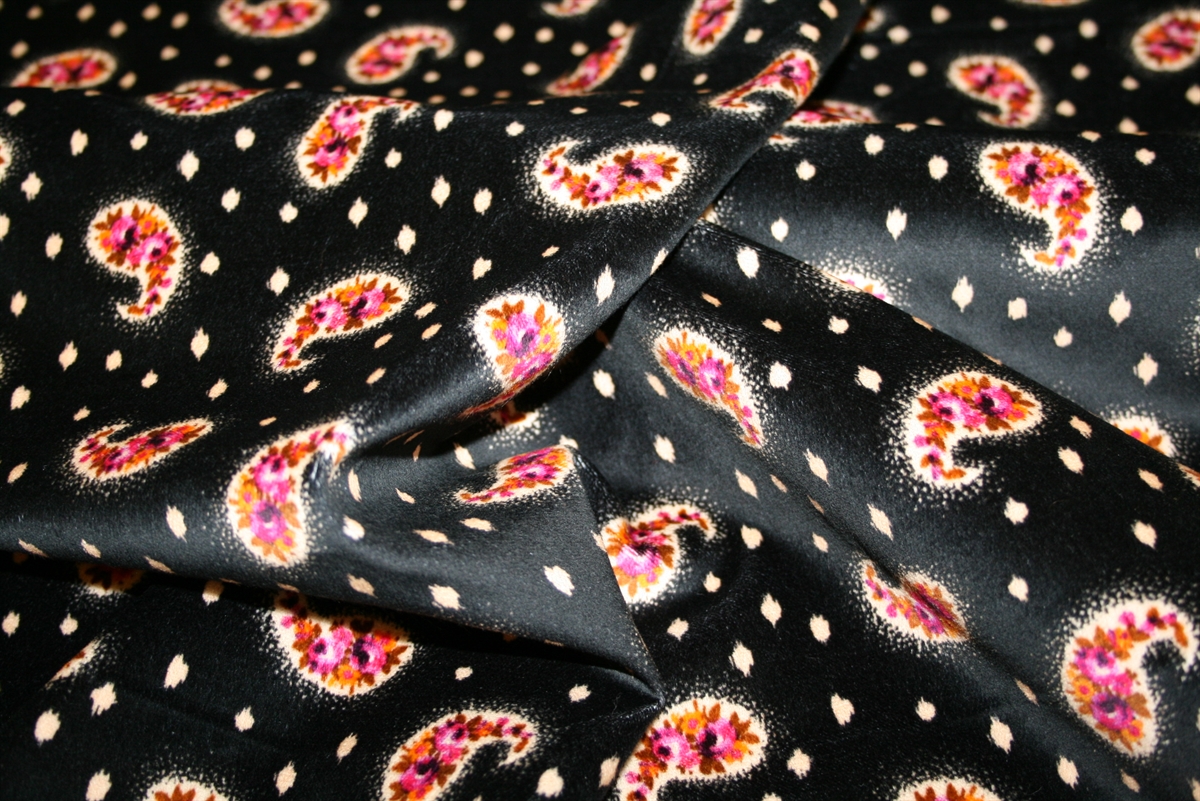 Bomuldsvelour med sjalsmønstre på en glansfuld sort bund. Kvaliteten er medium kraftig. Stoffet er produceret for Etro.