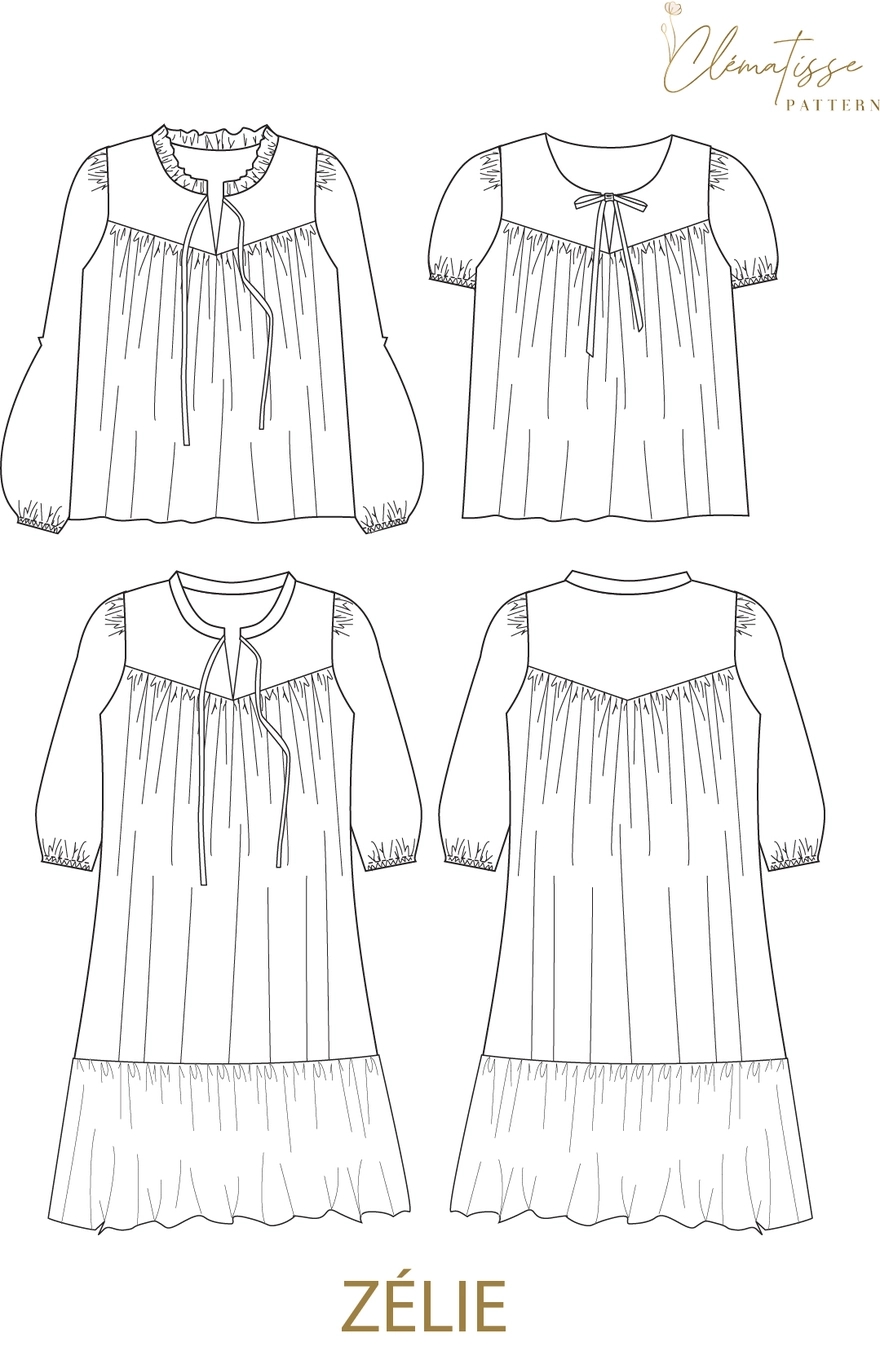 Modellen kan syes med forskellige kraver og ærmelængder. Alle variationer kan frit kombineres, så Zélie kan sys både som bluse eller kjole i utallige udgaver.